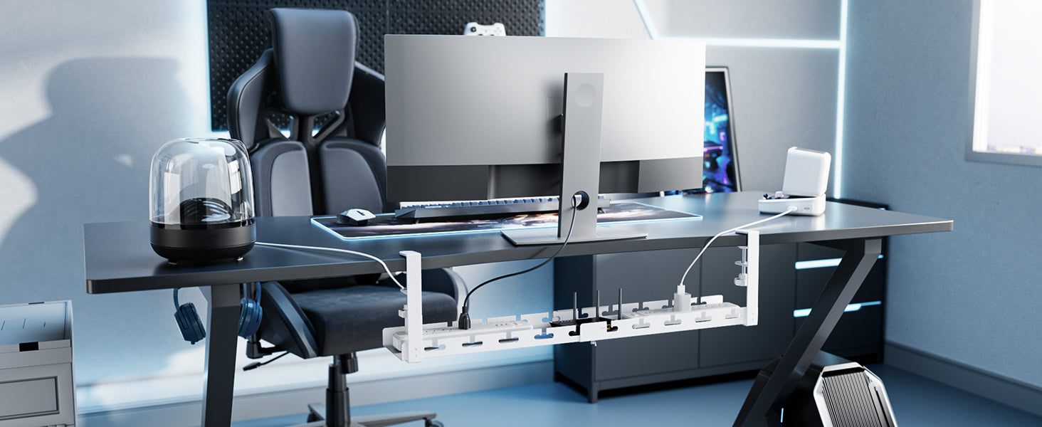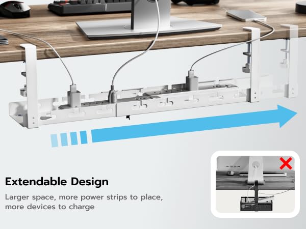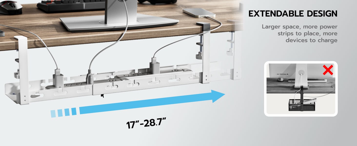 - 【Adjustable Length for Perfect Fit】Say goodbye to messy, tangled cables! With an extendable range from 17" to 28.7", this cable management under desk organizer adapts to desks of all sizes and setups—from compact home offices to large multi-monitor workstations. No need to worry about overhanging ends or awkward gaps—just a seamless, customized fit that keeps everything organized and off the floor.