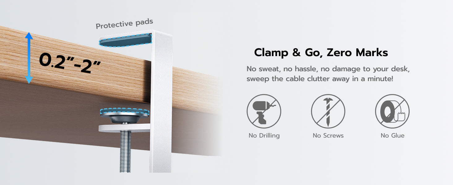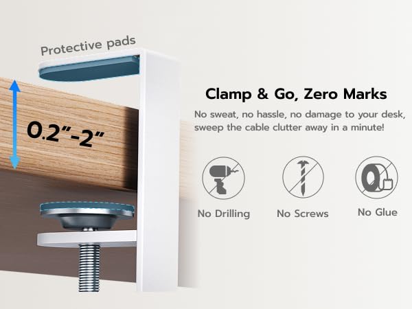 - 【No Damage Clamp-On Installation】Designed for hassle-free setup, this wire organizer uses a sturdy C-clamp system that attaches securely to your desk without any drilling or screws. Protect your furniture from permanent damage while enjoying a firm, stable hold—perfect for renters, students, or anyone who prefers a tool-free, stress-free installation. Compatible with desks ranging from 0.2" to 2" thick.