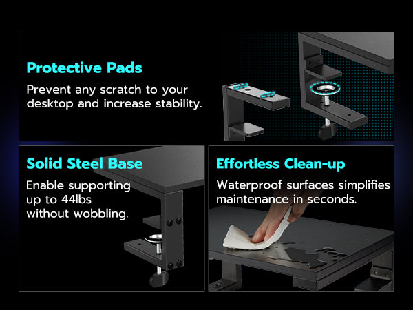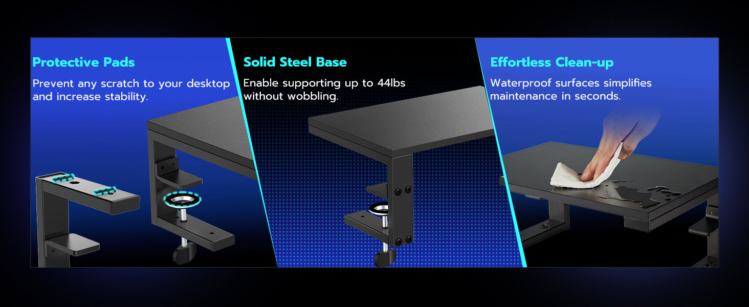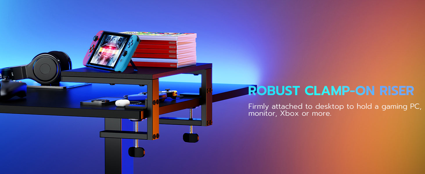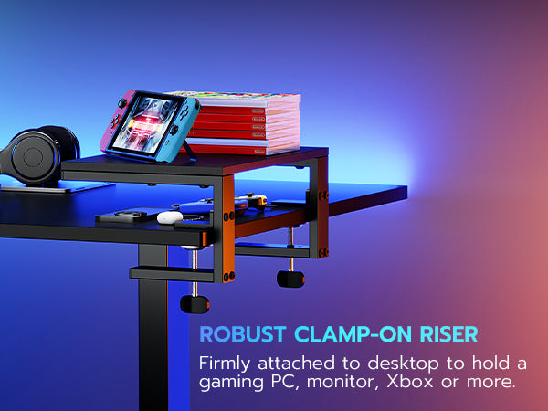 - Clamp-on Desktop Riser:If your desk is close to a wall, this practical desktop shelf features to be C-clamp mounted on any 0-2" thick table. In this way, you will adding a 15"x9.8" raised platform and an extra storage space below, to conveniently organize your play or working space