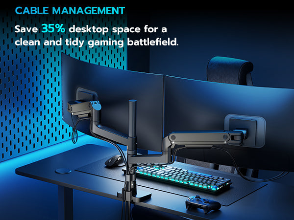 - 【Flexible Adjustability】The double monitor mount's maximum height is adjustable to 27.9'', and the maximum arm extension is 22.4''. With a stable gas spring, it offers a screen tilt of -50° to +20°, ±90° swivel, and 360° rotation. This height flexibility in the dual monitor arms allow for various screen stacking ways, providing more comfortable experience whether you are gaming or watching matches.