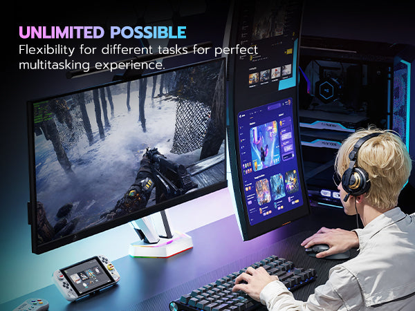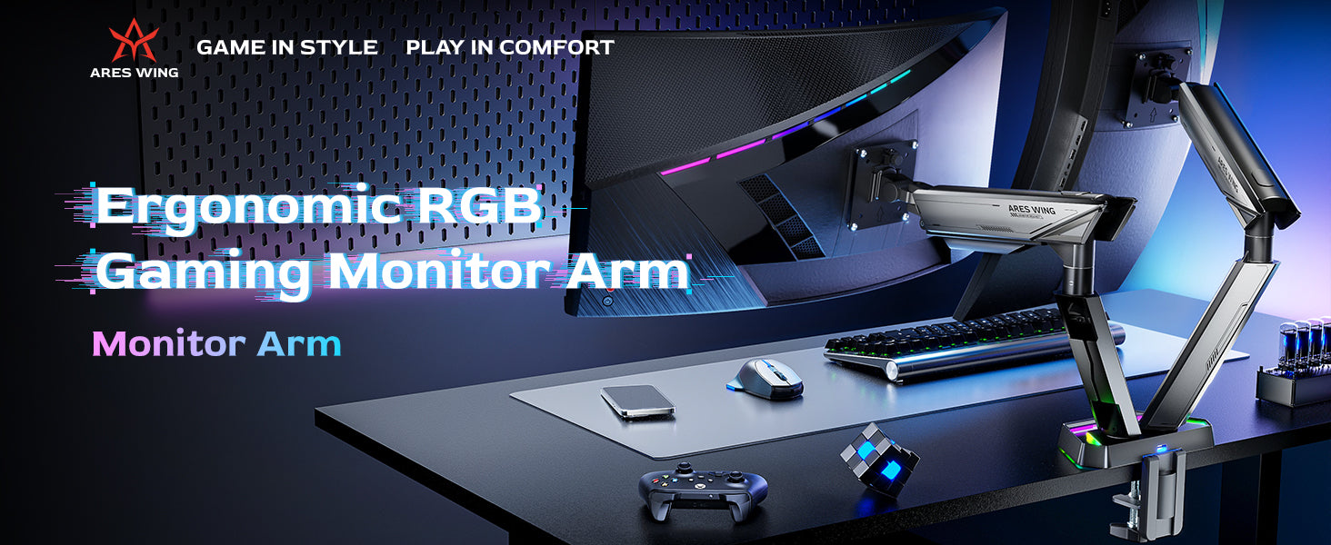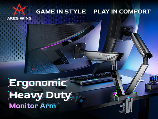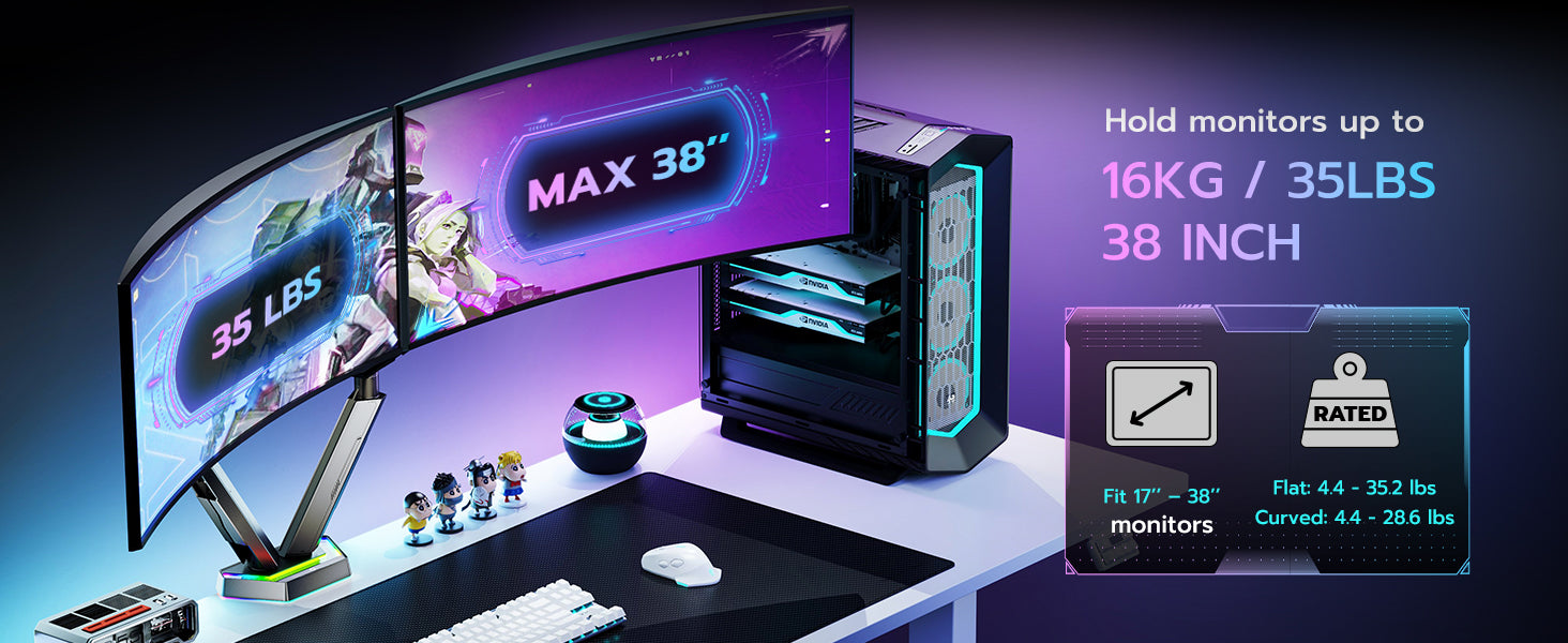- ARES WING Dual Monitor Mount—Engineered for two ultrawide monitors up to 38 inches and 35.2 pounds, this heavy-duty monitor arm combines strength and style. Its base features 20 captivating infinite mirror lighting effects, providing a mesmerizing light display without distractions. The quick-release VESA plate simplifies installation, while integrated cable management keeps your setup neat and organized. Designed for robust stability and flexibility, it’s the ultimate solution for supporting large, heavy monitors.