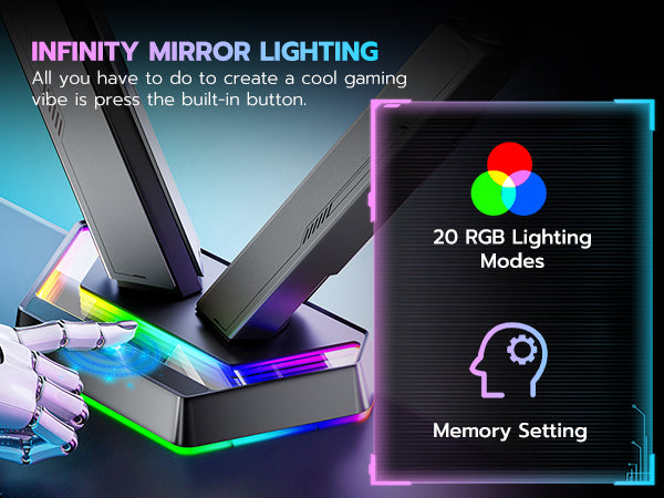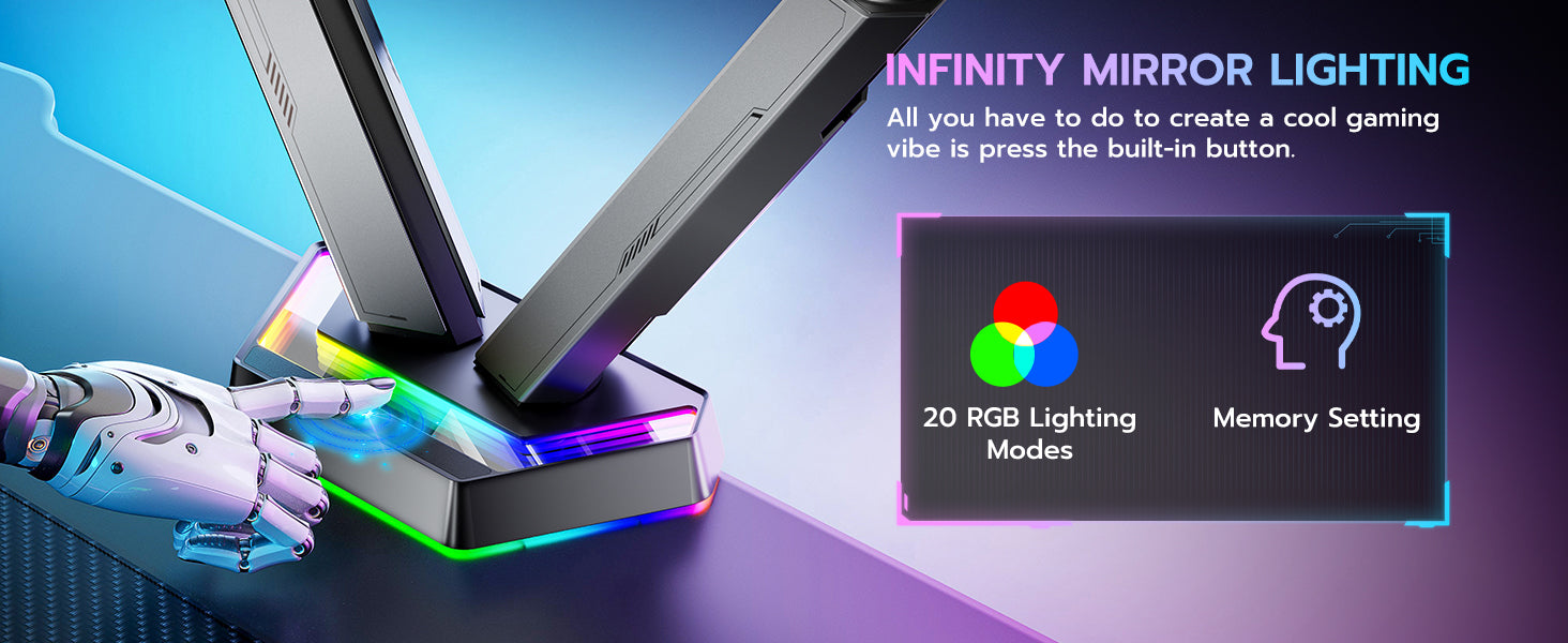 - 20 Infinite Mirror Lighting Effects—The ARES WING dual monitor arm features a unique base with 20 captivating infinite mirror lighting effects. With a simple button press, you can switch colors and modes to customize your workspace lighting. From soothing ambient hues to vibrant displays, these effects match your mood or activity, adding depth and style to any setup. Enhance your gaming or productivity space effortlessly with this dynamic, personalized touch.
