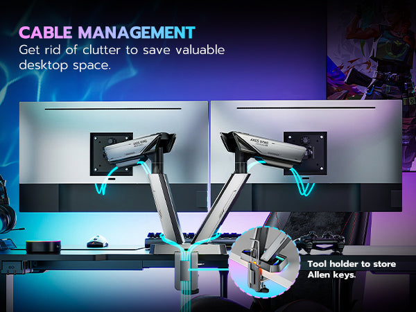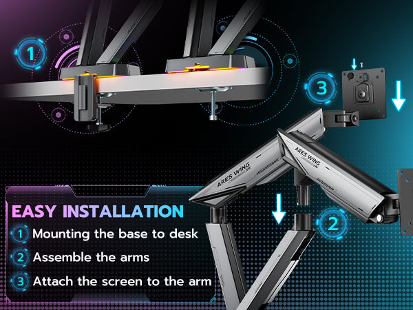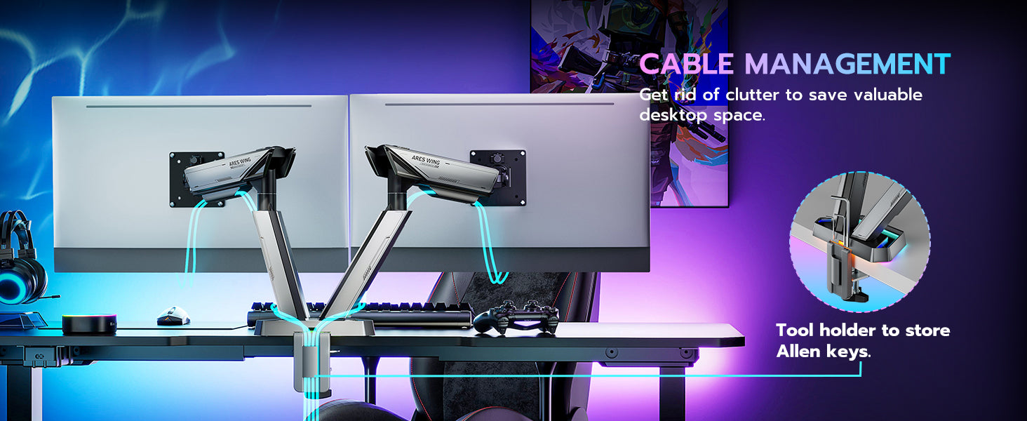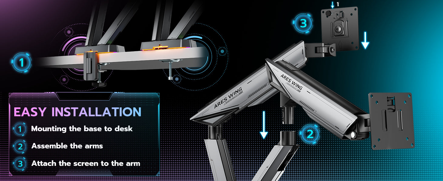 - Easy Installation & Cable Management—ARES WING dual monitor mount features cable management to reduce clutter and a tool slot for easy setup. It offers two mounting options: a C-clamp and a grommet mount, both supporting desks 0.4” to 3.1” thick. The quick-release VESA plate enables easy installation and removal, compatible with 75x75mm and 100x100mm VESA standards. Monitors with embedded VESA plates may need extra screws or spacers.