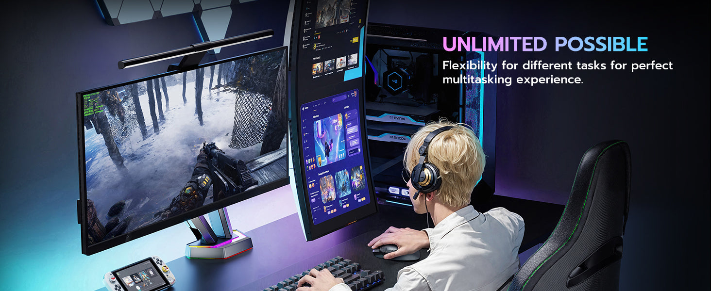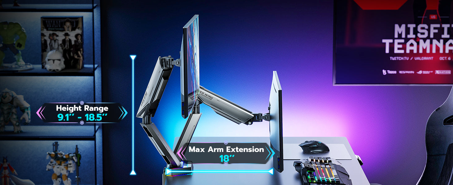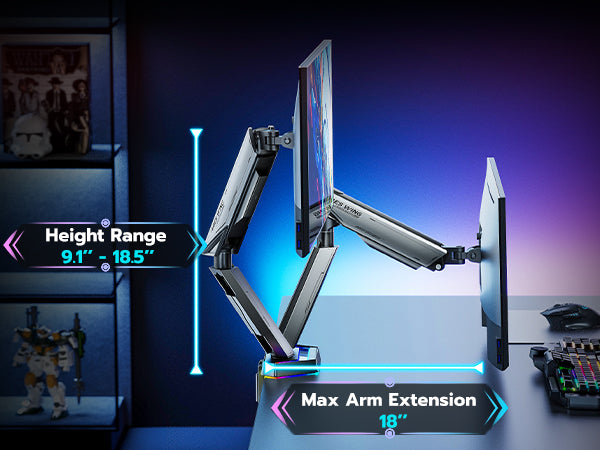 - Flexible Adjustability & Ideal for Multitasking—ARES WING dual arm monitor mount offers 18.5 inches of height adjustability, allowing for -60° to +60° tilt, ±90° rotation, and 360° swivel. This design helps alleviate the strain of hunching over, enabling you to comfortably participate in exciting esports competitions. With the ability to position two monitors at optimal heights and angles, you can easily switch between tasks, access multiple applications, and collaborate effectively.