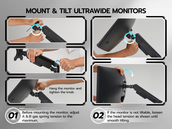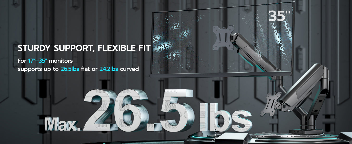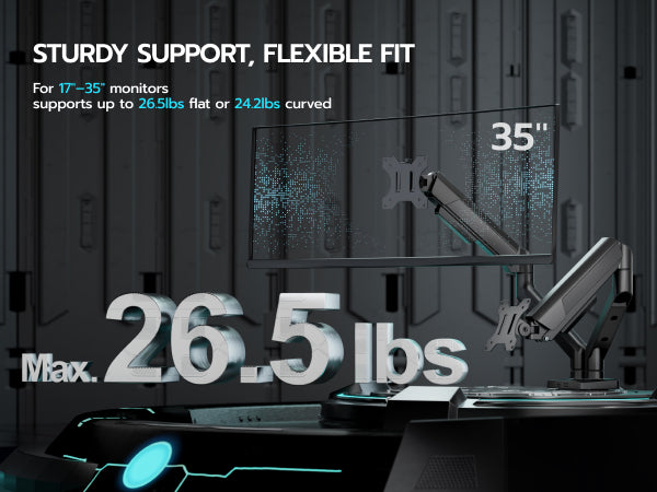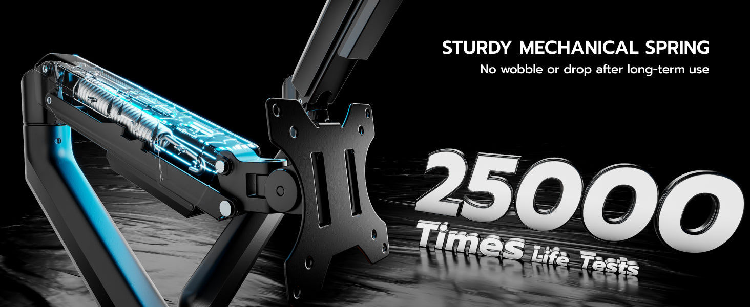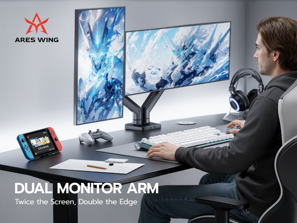 - 【Durability and Strength】Ares Wing dual Monitor arms supports up to 26.5 lbs and fits 17-35 inch ultrawide curved screens displays, ideal for gaming setup and office workstation. Its internal mechanical spring undergoes 25,000+ fatigue tests, ensuring long-lasting stability for heavy-duty use.