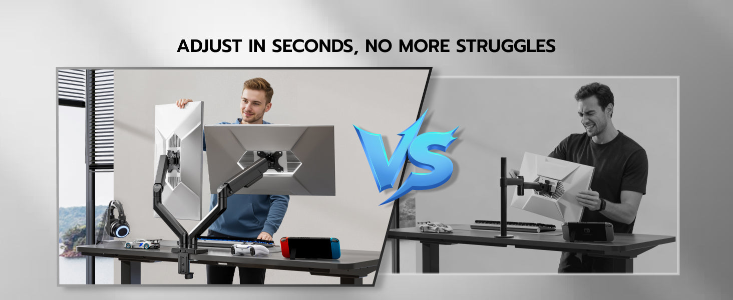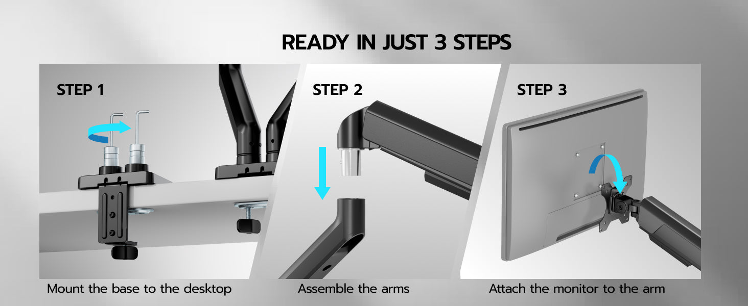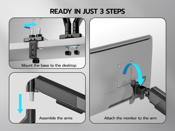 - 【Quick Installation】The quick-release VESA plate for simple monitor installation. Effortless setup via "Fix Base → Attach Arm → Mount Monitor" steps. Making this dual monitor stand ready for use in minutes.