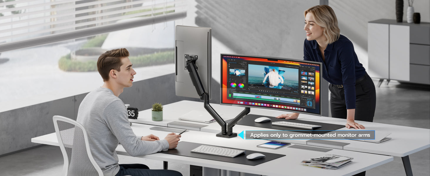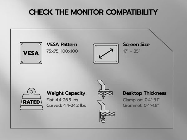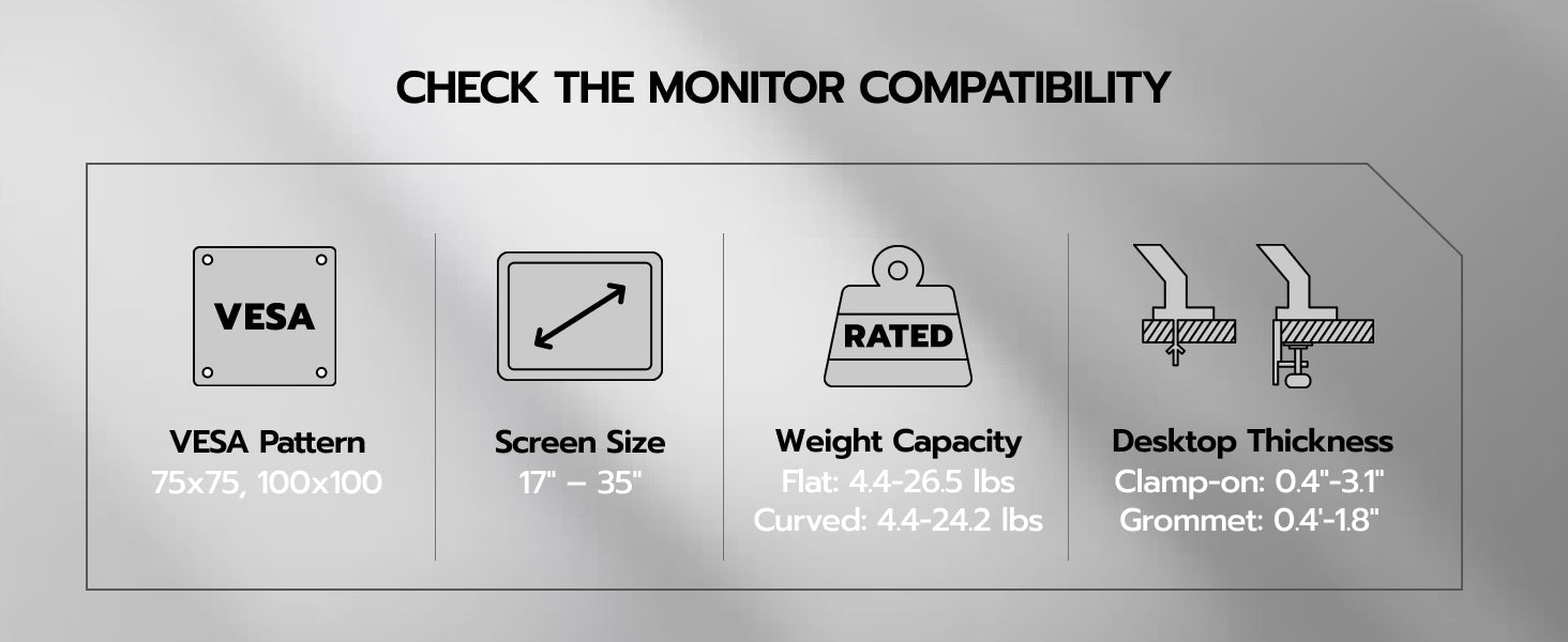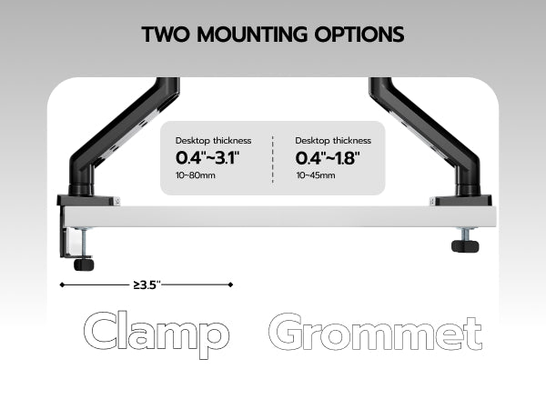 - 【C-Clamp & Grommet Base】It features full VESA compatibility (75x75, 100x100) and offers two versatile installation options C-Clamp (0.39"-3.15" thick desks) or Grommet Mount (0.39"-1.77" thick desks).