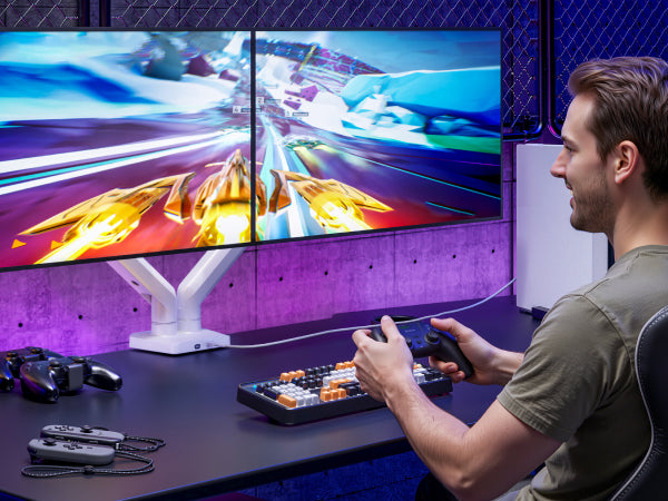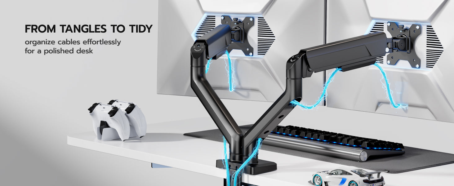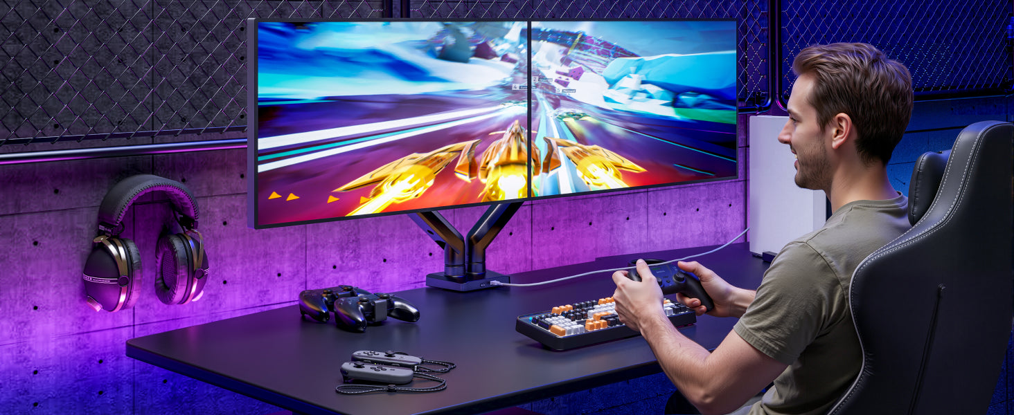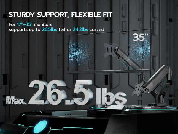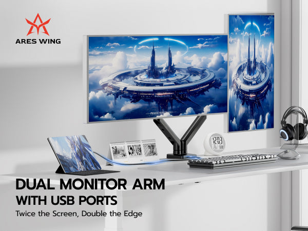 - 【Durability and Strength】Ares Wing dual Monitor arms supports up to 24.2 lbs and fits 17-35 inch ultrawide curved screens displays, ideal for gaming setup and office workstation. Its internal mechanical spring undergoes 25,000+ fatigue tests, ensuring long-lasting stability for heavy-duty use.
