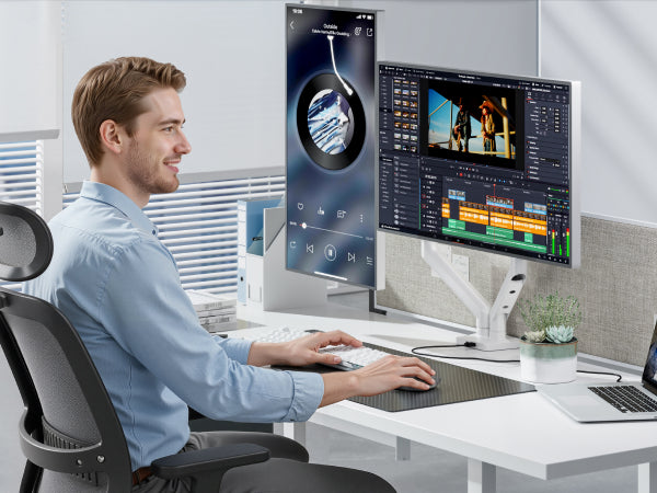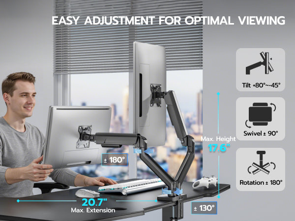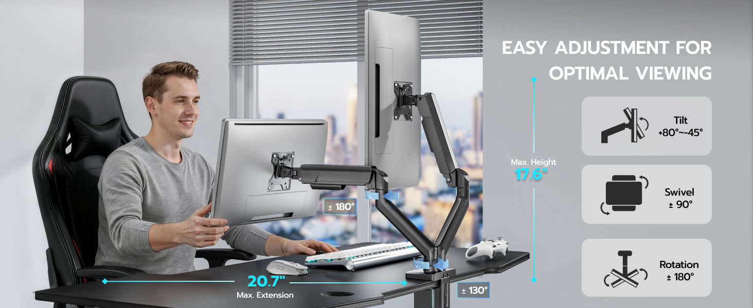 - 【Ergonomic Viewing Angles】Customize your setup with 17.63" height adjustment, 18.4" extension range, ±180° swivel, 360° rotation, and +90°/-90° tilt. Achieve eye-level alignment effortlessly.