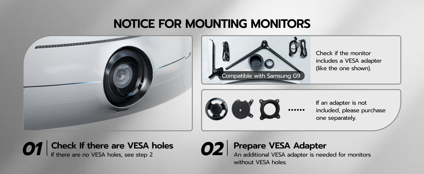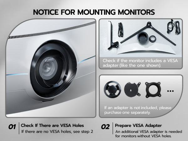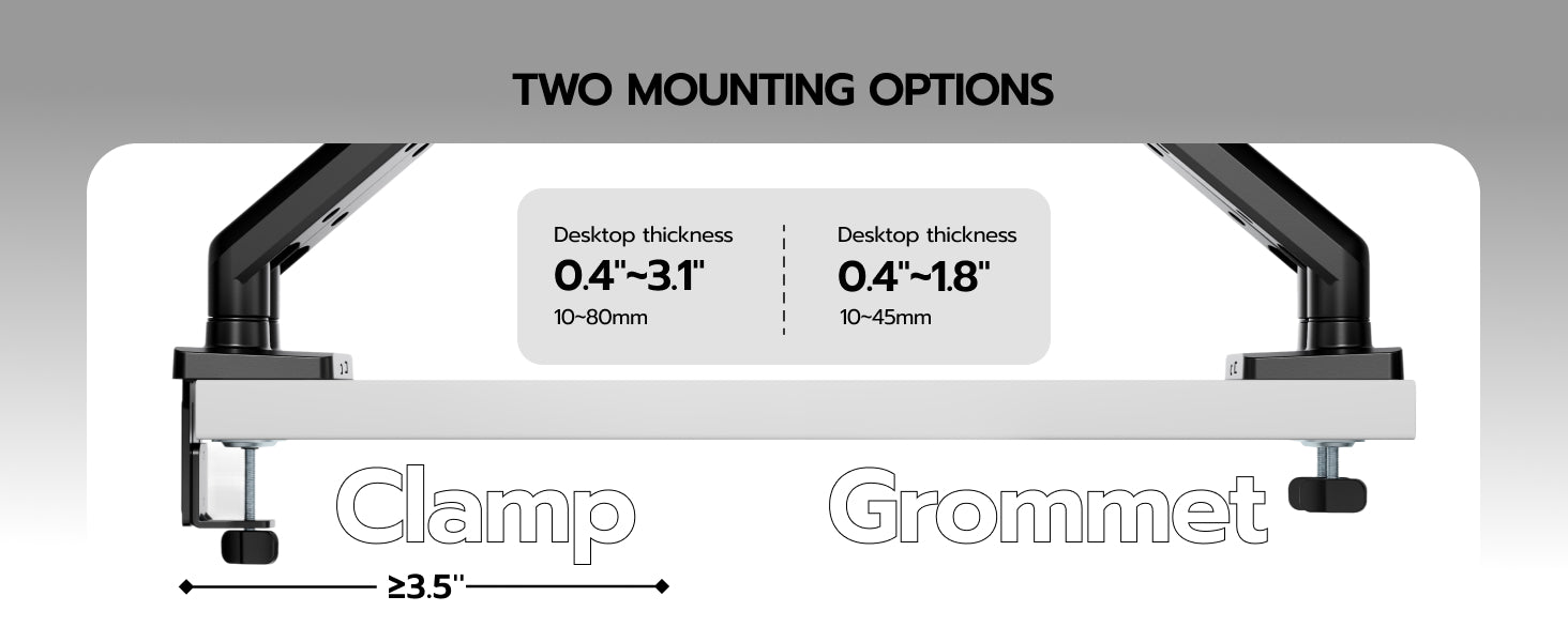 - 【C-Clamp & Grommet Base】It features full VESA compatibility (75x75, 100x100) and offers two versatile installation options C-Clamp (0.39"-3.15" thick desks) or Grommet Mount (0.39"-1.77" thick desks).