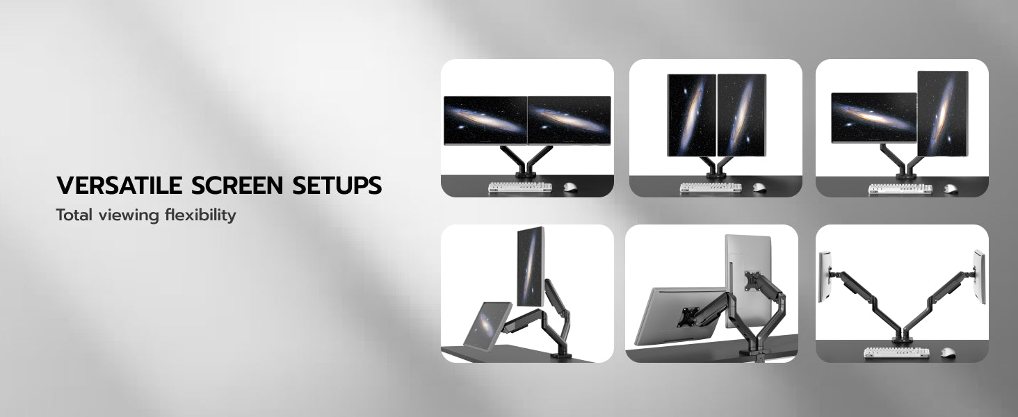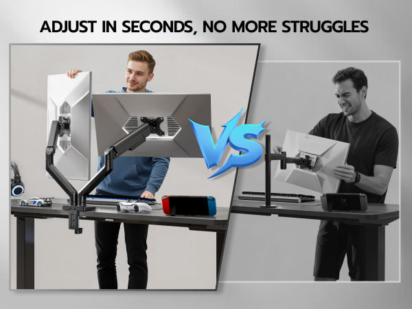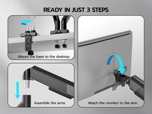 - 【Quick Installation】The quick-release VESA plate for simple monitor installation. Effortless setup via "Fix Base → Attach Arm → Mount Monitor" steps. Making this dual monitor stand ready for use in minutes.