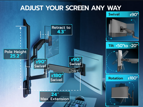 - 【Full Adjustability & Extended 25.2" Pole】This wall monitor mount takes flexibility to the next level with its upgraded 25.2" height pole and ultra-smooth dual-arm movement. Enjoy +50° to -20° tilt, 180° swivel, 360° rotation, and a 24" max arm extension—all designed to help you find the perfect viewing angle. Whether you’re deep in a game or focused on work, this mount lets you maintain an ergonomic posture, reducing neck and back strain for all-day comfort.