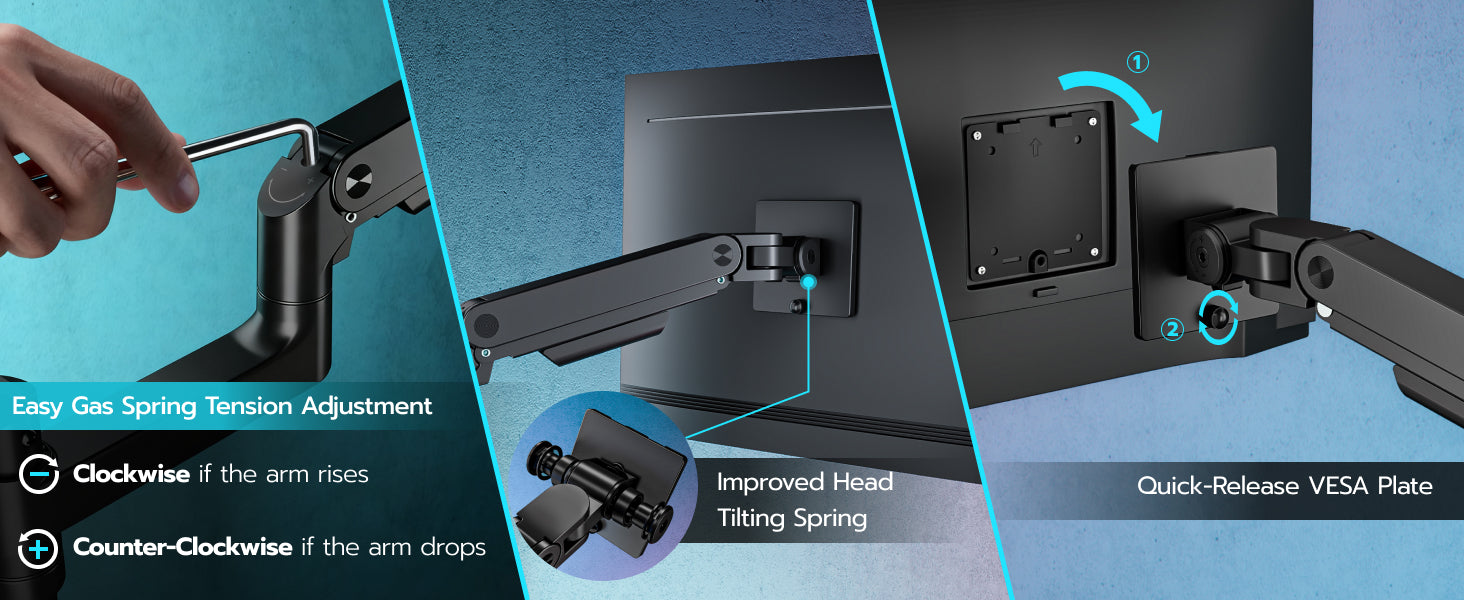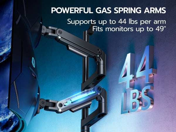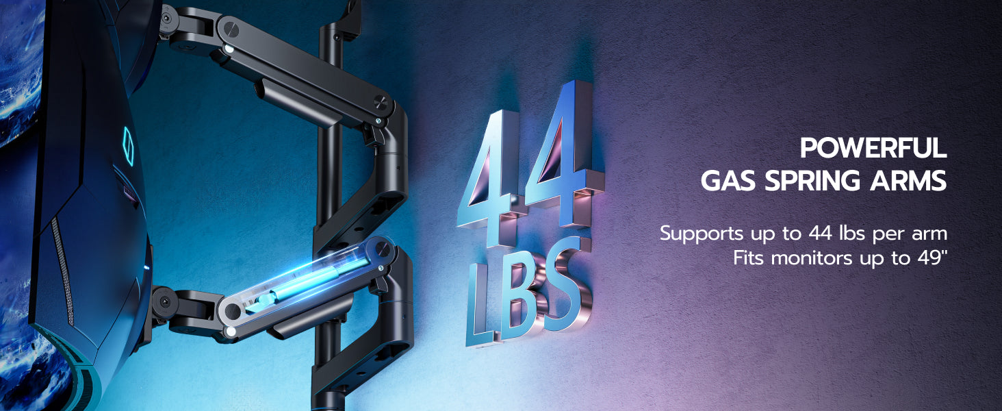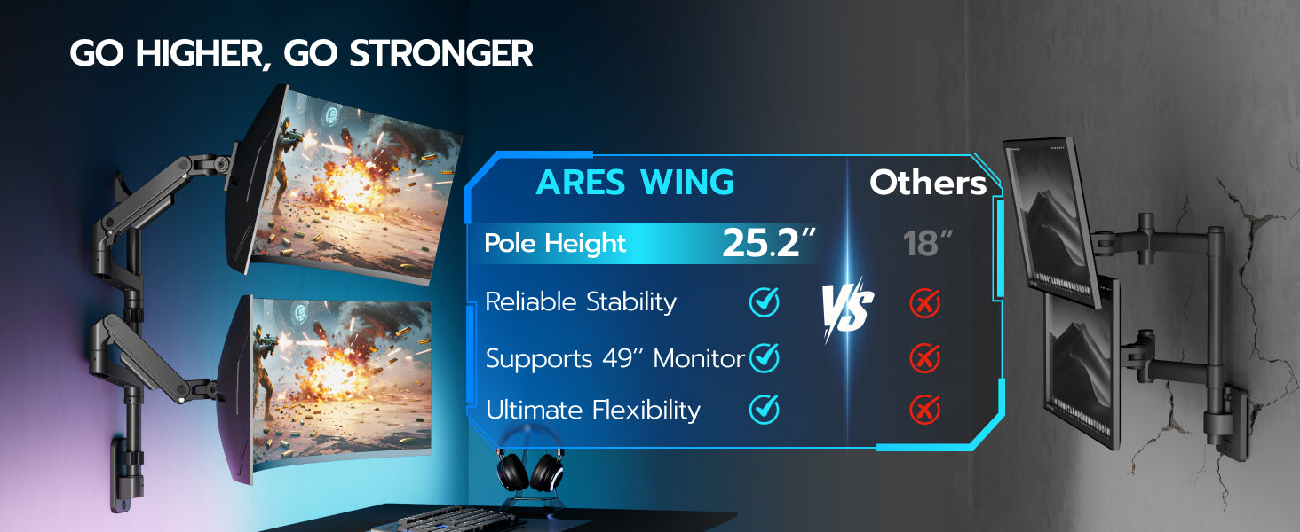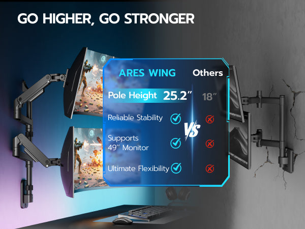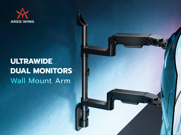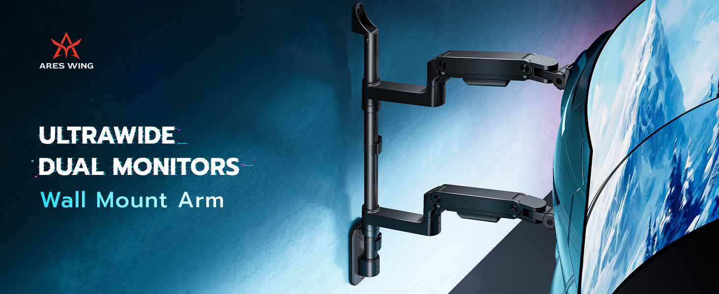 - 【Tailored for 2 Ultrawide Monitors】The ARES WING dual monitor arm is engineered to handle today’s ultrawide and curved monitors with confidence. With a reinforced dual-arm structure and upgraded tilt mechanism, it securely supports screens up to 49 inches and 44 lbs, including 1000R curved models. Perfect for mounting your 17"-49" display directly on the wall for a cleaner, more immersive setup. Note: For monitors without VESA holes, a VESA adapter is required.
