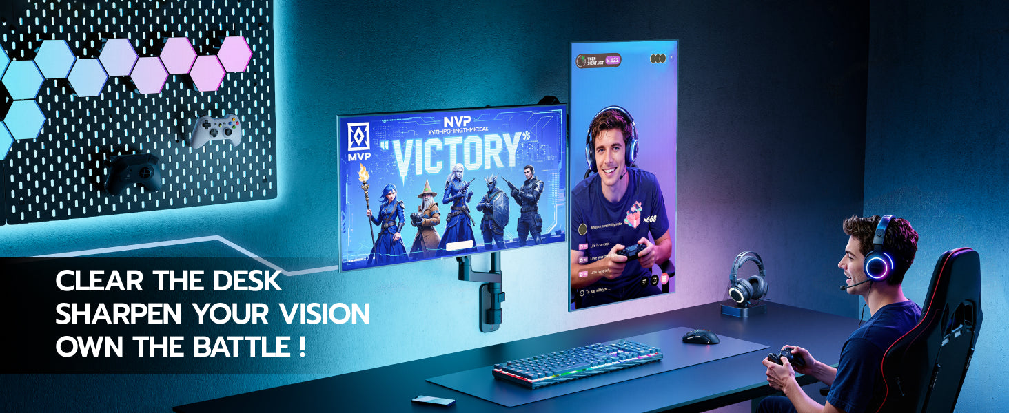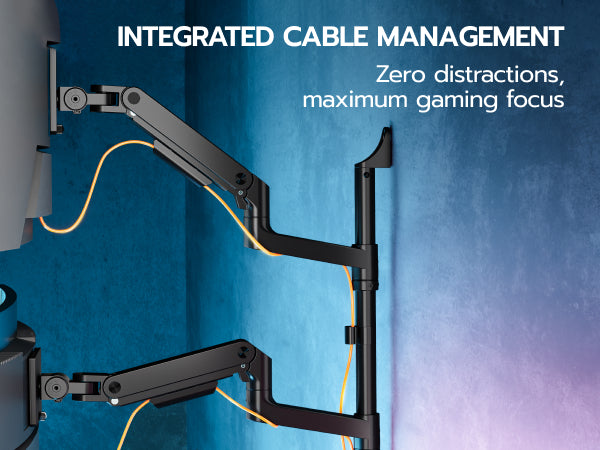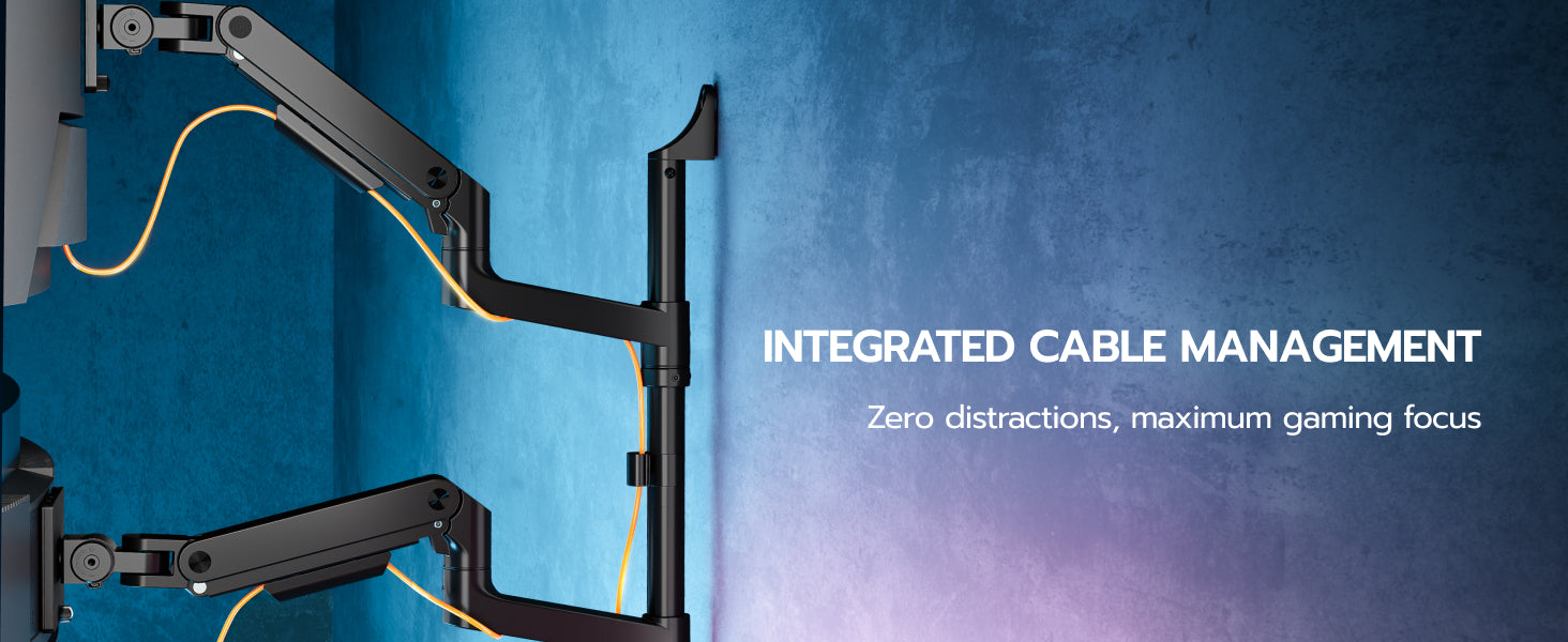 - 【Free Up & Redefine Your Desktop】Transform your workspace with ARES WING dual monitor mount wall. By securely mounting your monitors on the wall, you’ll instantly free up valuable desk space for a sleek and more efficient setup. When not in use, the arms can retract neatly to just 4.3" from the wall. Additionally, the integrated cable management system conceals messy wires, giving your setup that professional, clutter-free look every gamer and creator loves.