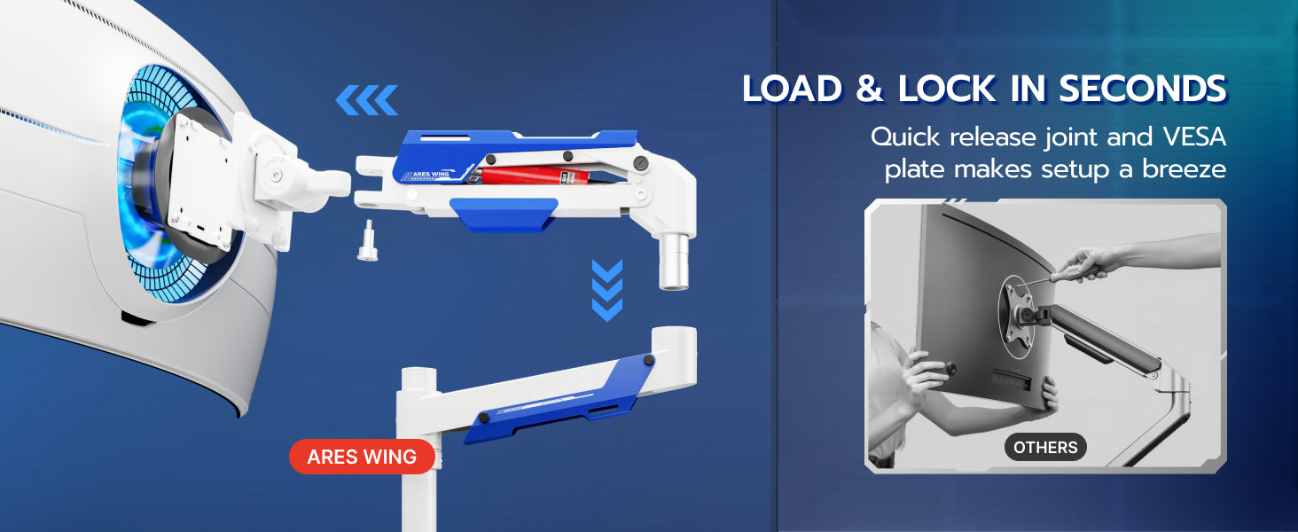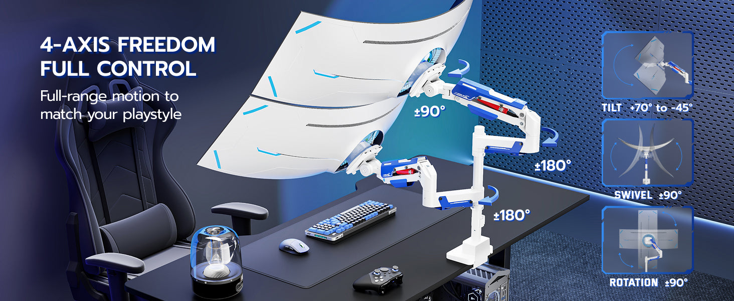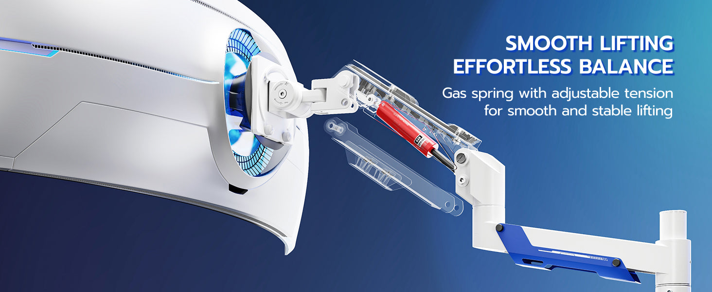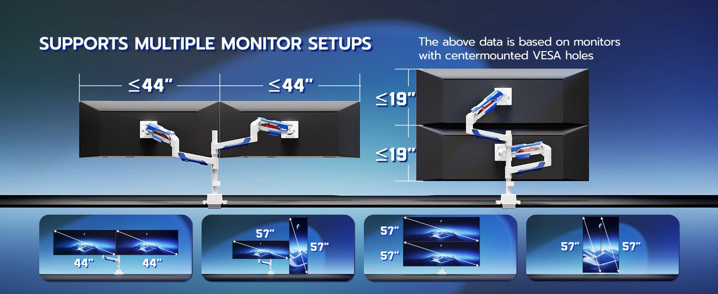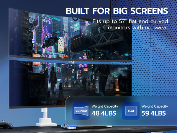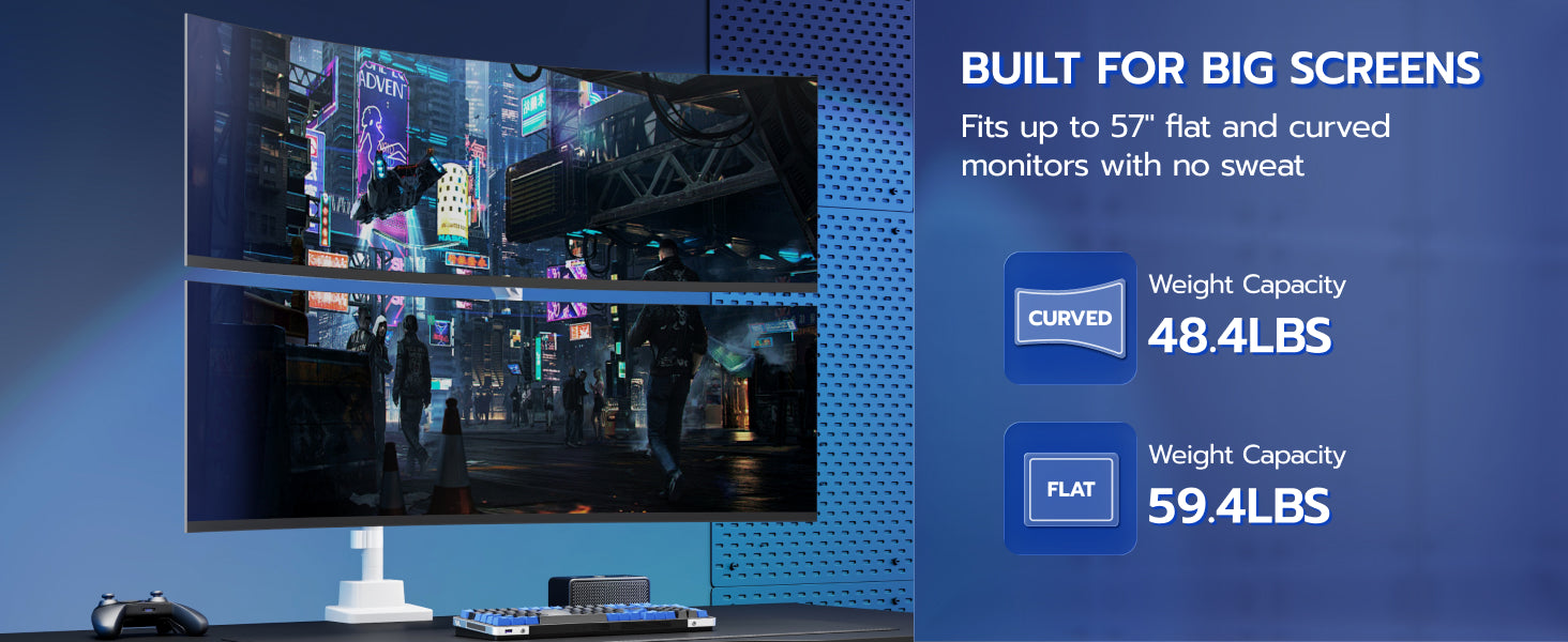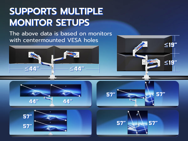 - 【Born for Ultrawide Screens】 Ultrawide monitor arm made with high-quality aluminum, featuring enhanced tilting structure and gas springs, effortlessly hold flat screen up to 59.4 lbs & curved up to 48.4 lbs each arm, VESA patterns include 75x75, 100x100, 200x100, 200x200mm. Compatible with the Samsung Odyssey G9, LG, and other ultrawide monitors