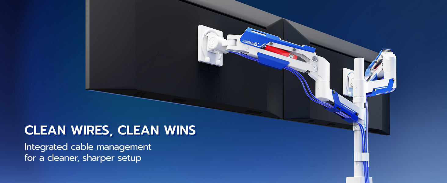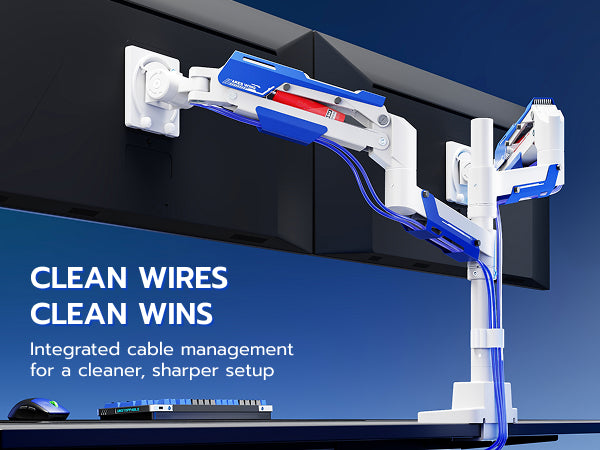 - 【Save Your Desktop】By mounting your two monitors on the arms, this ultrawide monitor arm can free up 50% valuable desktop space for you. The built-in cable management system neatly hides cables and cords out of sight, creating a cleaner and more organized workspace.
