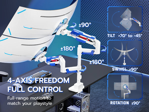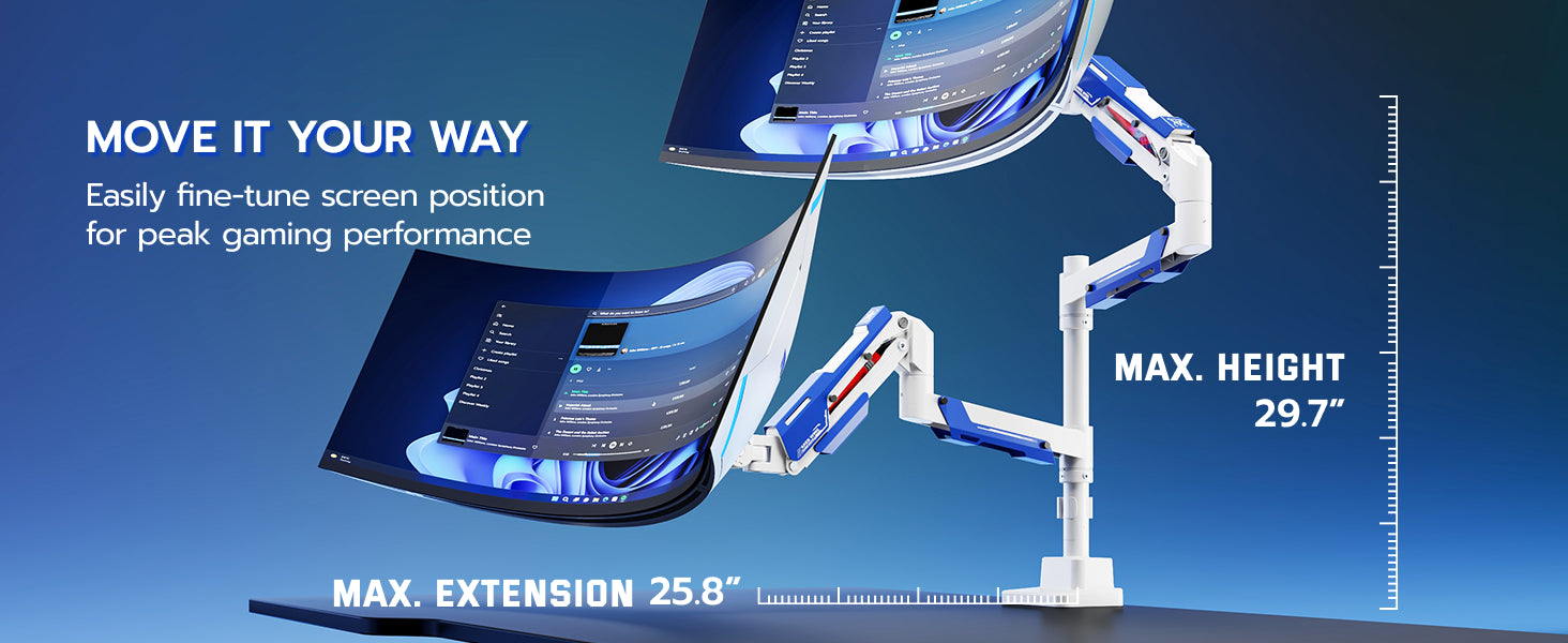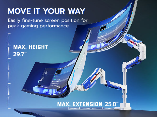 - 【Flexible Adjustability】【Flexible Adjustability】This dual monitor mount allows for a wide range of movement, including +70 ° to -45 ° tilt, +90 ° to -90 ° swivel, 360 °rotation, providing an optimal ergonomic posture and relieving strain on the spine, neck, and shoulders. Fearturing the maximum extension of 25.8 " and maximum arm of 29.7 " height, the double monitor mount allows for various screen stacking ways, providing a comfortable experience for gaming or viewing.
