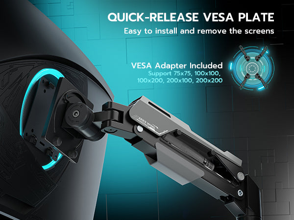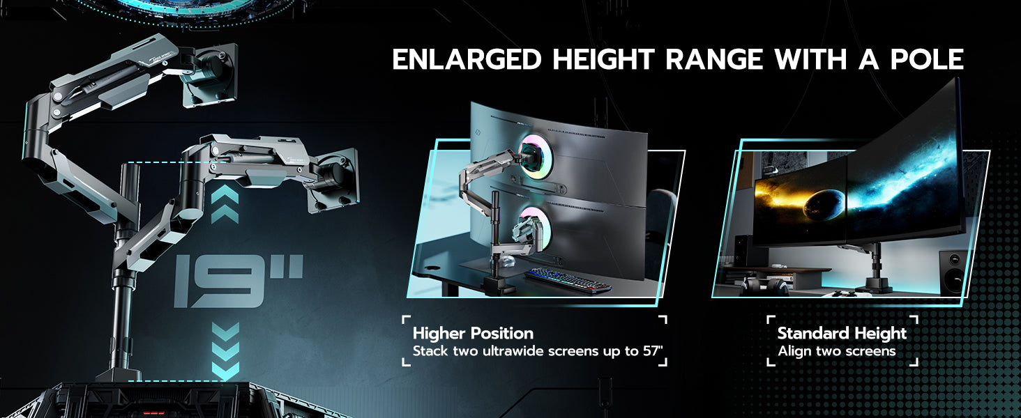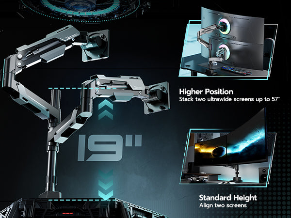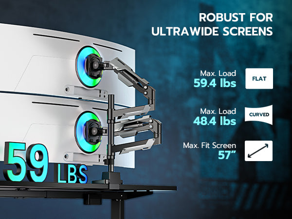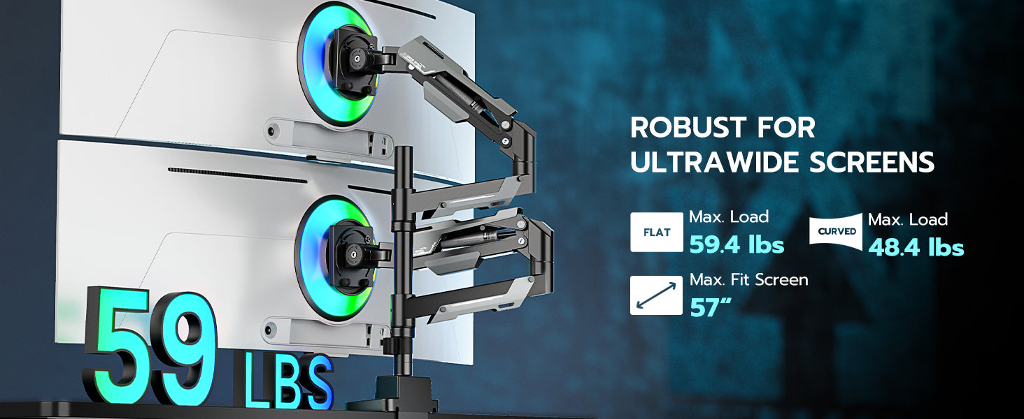 - 【Born for Ultrawide Screens】Designed for ultrawide heavy duty computer monitors, this dual stacked monitor mount supports flat and curved screens up to 57 inches per arm, holding flat monitors up to 59 lbs and curved monitor up to 48 lbs. Compatible with the Samsung Odyssey G9, LG, and other 49 " and 57 " ultrawide monitors, this dual screen monitor includes VESA mount adapters fitting 75x75 mm, 100x100 mm, 100x200 mm, 200x100 mm and 200x200 mm