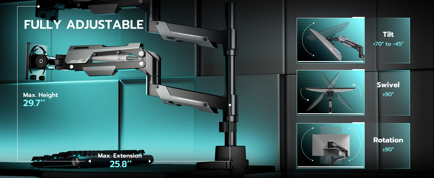 - 【Flexible Adjustability】This dual monitor mount allows for a wide range of movement, including +70 ° to -45 ° tilt, +90 ° to -90 ° swivel, 360 °rotation, providing an optimal ergonomic posture and relieving strain on the spine, neck, and shoulders. Fearturing the maximum height of 25.8 " and maximum arm extension of 29.7 ", the double monitor mount allows for various screen stacking ways, providing a comfortable experience for gaming or viewing