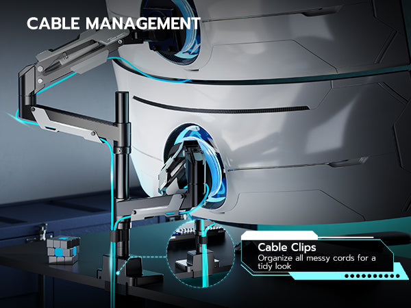 - 【Save Your Desktop】By mounting your two monitors on the arms, this ultrawide monitor arm can free up 50% valuable desktop space for you. The built-in cable management system neatly hides cables and cords out of sight, creating a cleaner and more organized workspace. What's more, the two integrated USB ports can provide convenient charging options for your phone, watch, tablet, laptop, and headphones at any time