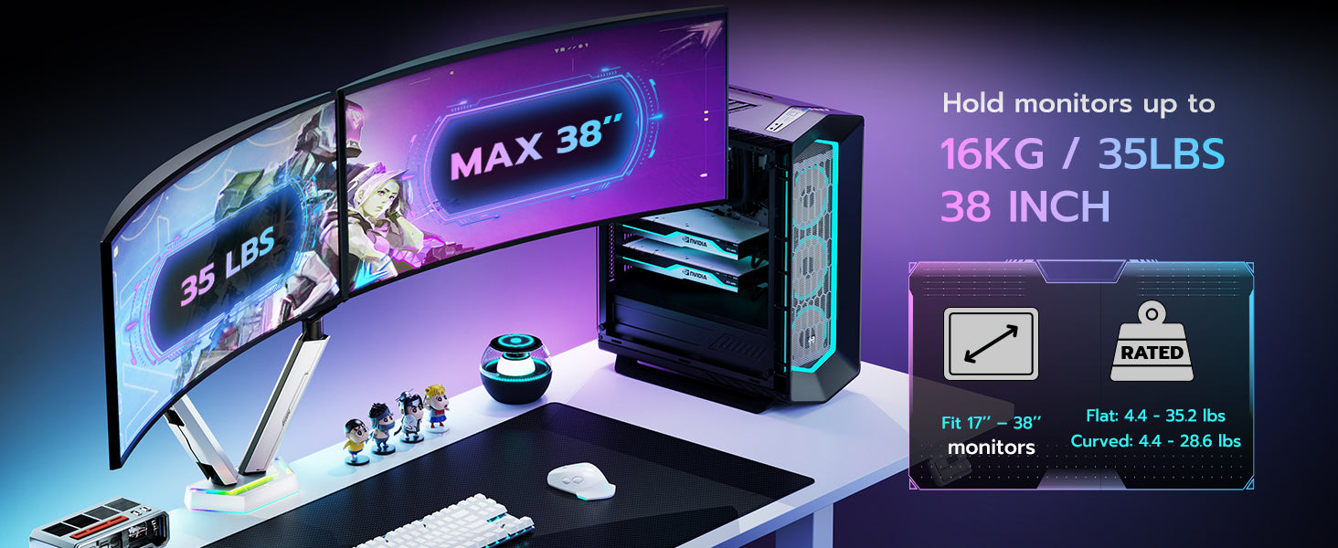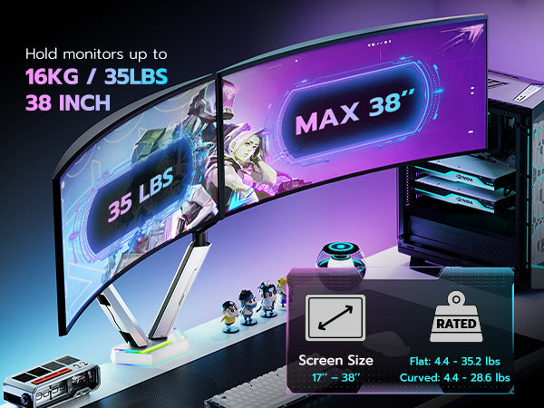 - Supports up to 38" & 35.2lbs Ultrawide Monitors –The ARES WING VESA dual monitor mount supports ultrawide monitors up to 38 inches and 35.2 lbs each, fitting both flat (4.4–35.2 lbs) and curved (4.4–28.6 lbs) screens. Built with industrial-grade iron and aluminum, it ensures superior stability and durability, perfect for workstations and gaming setups.