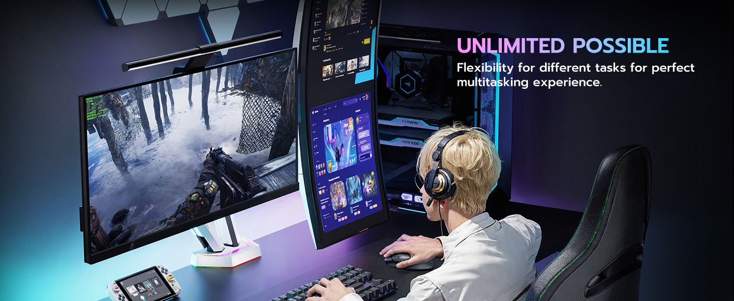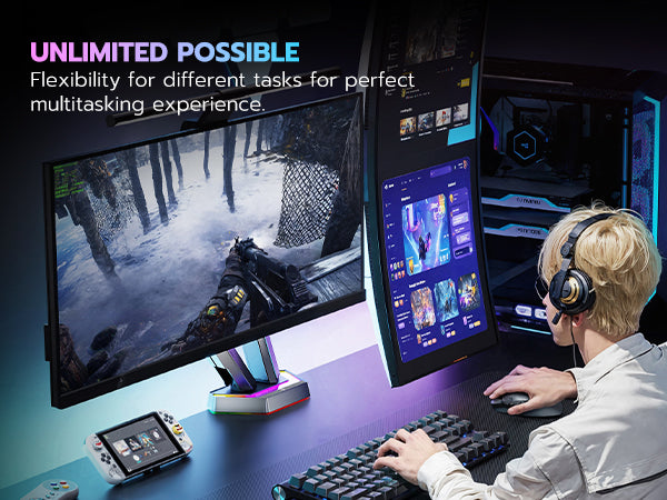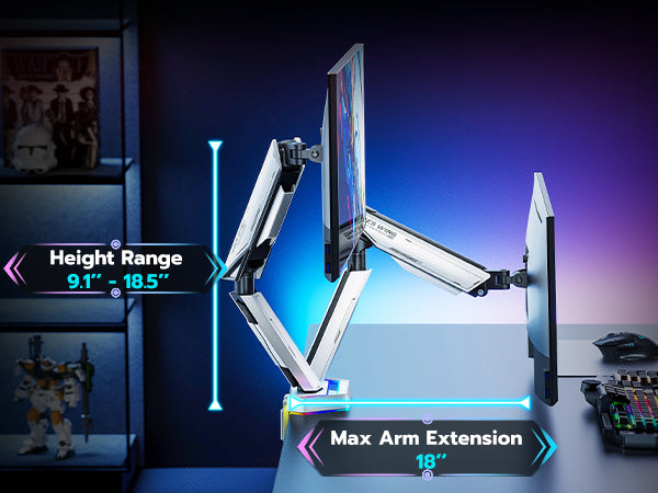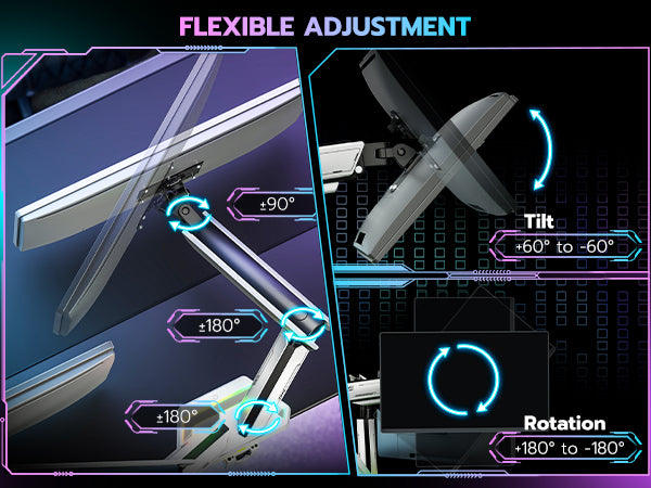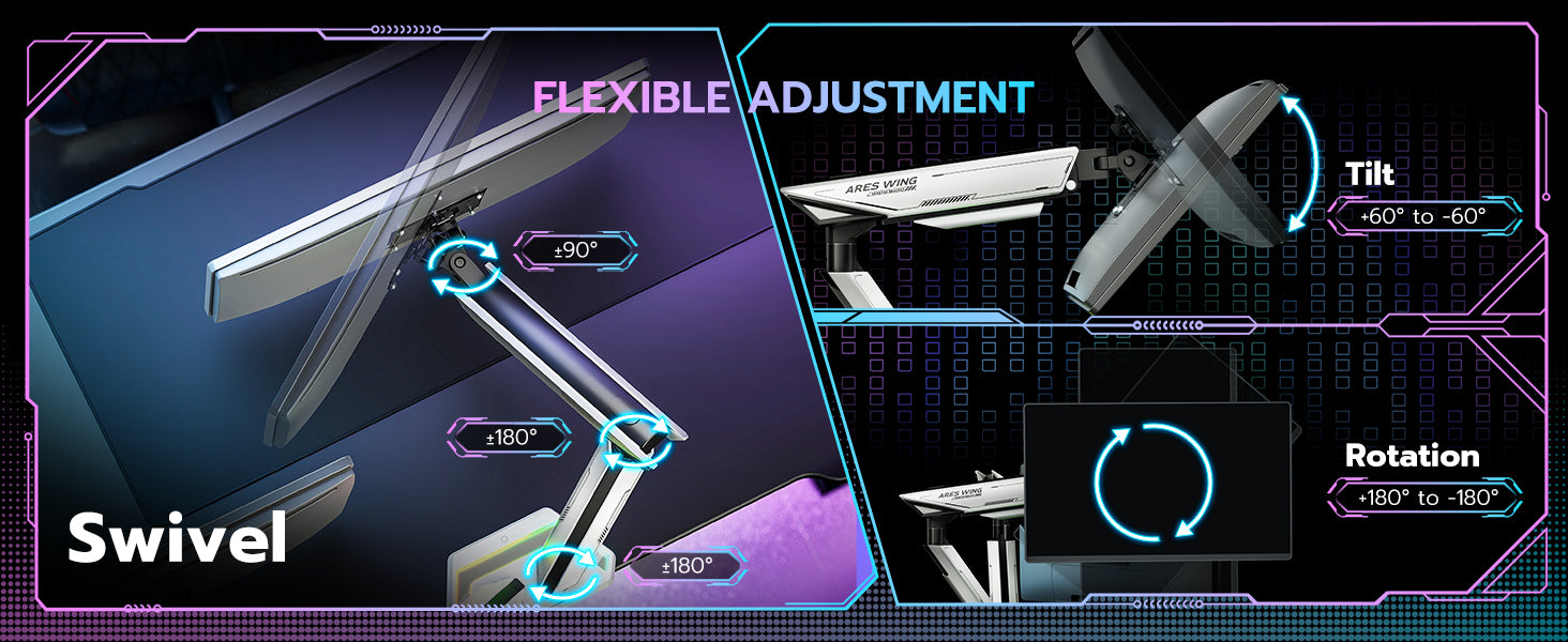- Flexible Adjustability & Ideal for Multitasking—ARES WING dual arm monitor mount offers 18.5 inches of height adjustability, allowing for -60° to +60° tilt, ±90° rotation, and 360° swivel. This design helps alleviate the strain of hunching over, enabling you to comfortably participate in exciting esports competitions. With the ability to position two monitors at optimal heights and angles, you can easily switch between tasks, access multiple applications, and collaborate effectively.