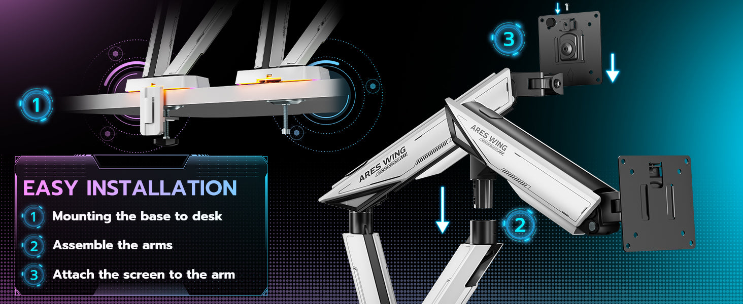 - Easy Installation & Cable Management—ARES WING dual monitor mount features cable management to reduce clutter and a tool slot for easy setup. It offers two mounting options: a C-clamp and a grommet mount, both supporting desks 0.4” to 3.1” thick. The quick-release VESA plate enables easy installation and removal, compatible with 75x75mm and 100x100mm VESA standards. Monitors with embedded VESA plates may need extra screws or spacers.