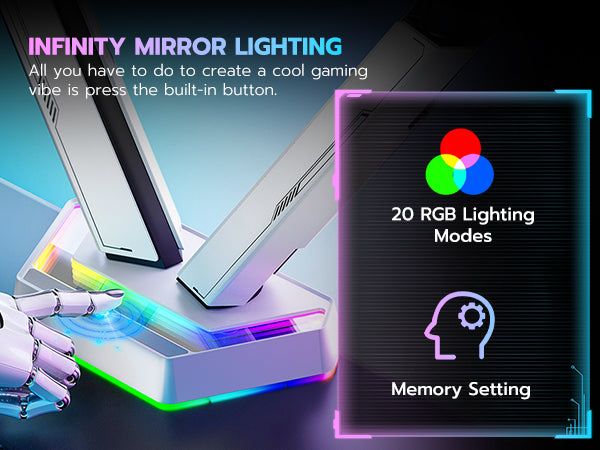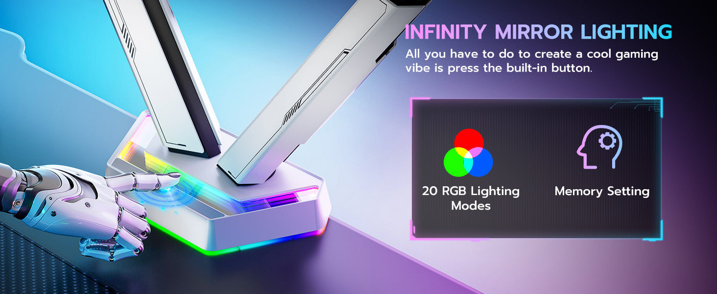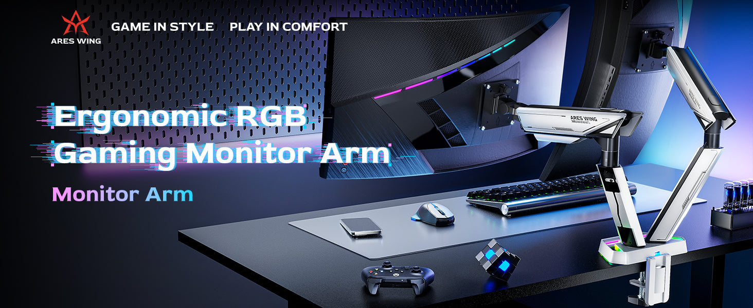 - 20 Infinite Mirror Lighting Effects—The ARES WING dual monitor arm features a unique base with 20 captivating infinite mirror lighting effects. With a simple button press, you can switch colors and modes to customize your workspace lighting. From soothing ambient hues to vibrant displays, these effects match your mood or activity, adding depth and style to any setup. Enhance your gaming or productivity space effortlessly with this dynamic, personalized touch.