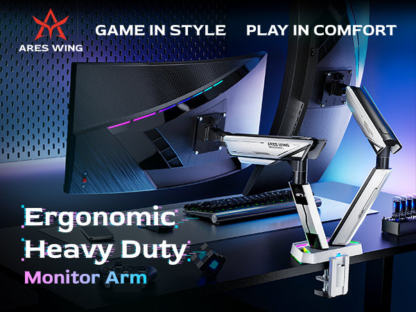 - ARES WING Dual Monitor Mount—Engineered for two ultrawide monitors up to 38 inches and 35.2 pounds, this heavy-duty monitor arm combines strength and style. Its base features 20 captivating infinite mirror lighting effects, providing a mesmerizing light display without distractions. The quick-release VESA plate simplifies installation, while integrated cable management keeps your setup neat and organized. Designed for robust stability and flexibility, it’s the ultimate solution for supporting large, heavy monitors.