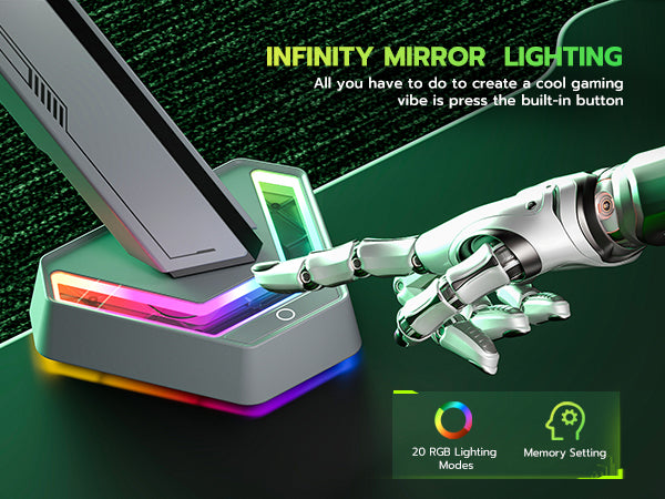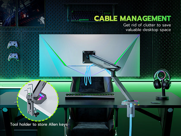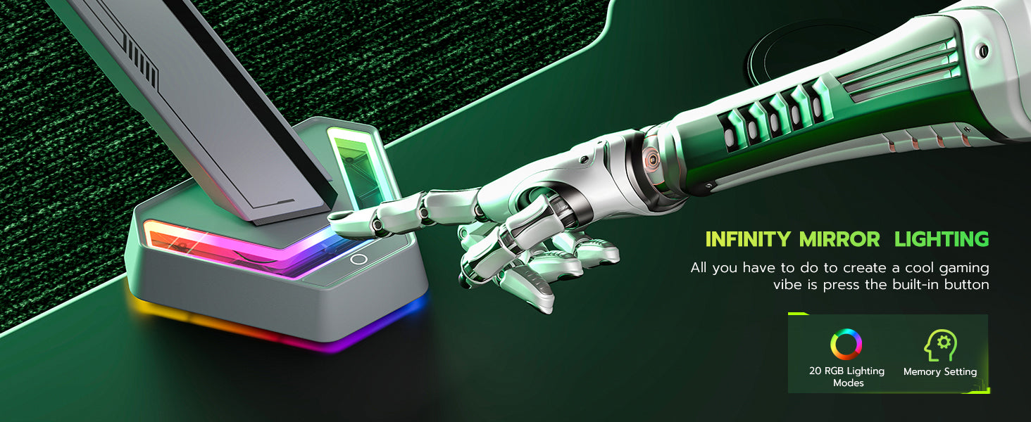 - 20 Infinite Mirror Lighting Effects — This single-arm monitor mount features a base with 20 captivating infinite RGB lighting effects that can be toggled on for immersive gaming or off for a focused work environment. With customizable lighting, this mount enhances your setup’s ambiance to perfectly match your gaming mood. Immerse yourself in a world of vibrant colors and precise gameplay for the ultimate experience.