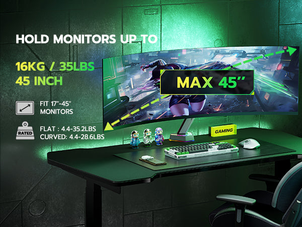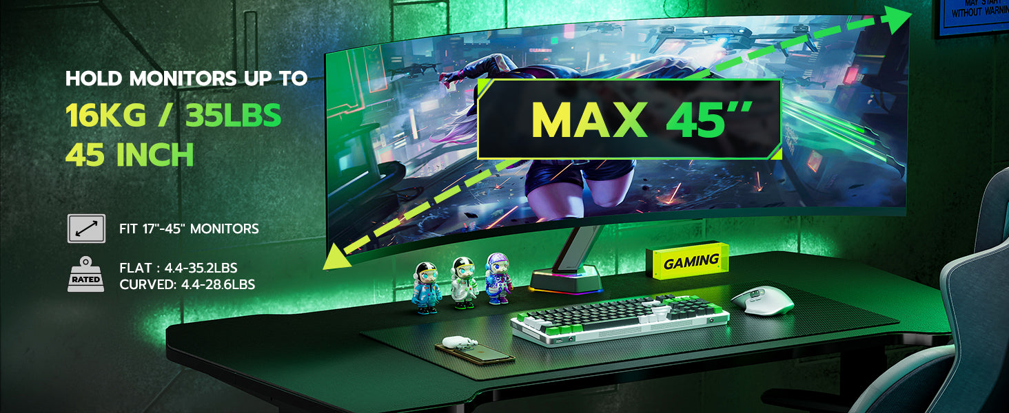 - Supports up to 45" & 35.2lbs Ultrawide Monitors – The ARES WING monitor arm 45 inch features an optimized tilt structure, providing excellent support for ultrawide screens, including 45" flat and curved monitors. It accommodates flat monitors weighing 4.4–35.2 lbs and curved monitors from 4.4–28.6 lbs. Compatible with VESA 100x100mm and 75x75mm standards, this arm ensures wide adaptability. For non-VESA monitors, a VESA mount adapter is required. Please confirm your monitor’s weight and type to ensure it is within the supported range.
