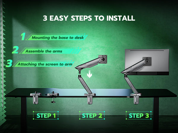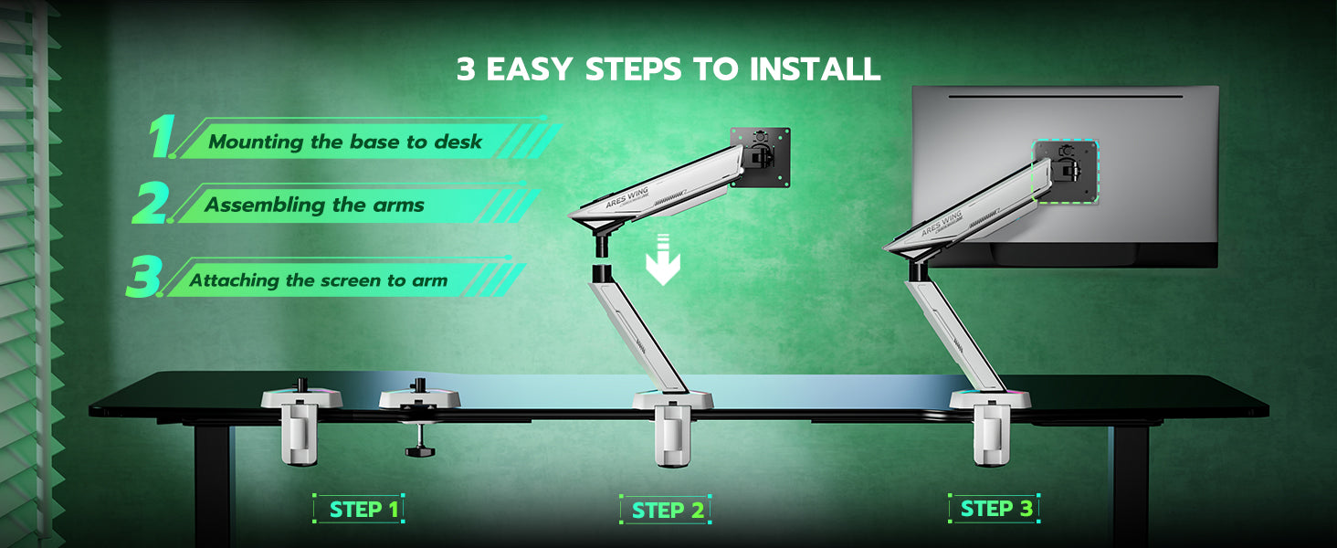 - East Installation & Cable Management - ARES WING VESA mount offers easy installation with a quick-release plate, compatible with 75x75mm and 100x100mm VESA standards. It supports two mounting options: a C-clamp for desks 0.39”–3.1” thick and a grommet mount for 0.39”–1.6” thick desks. The mount also features cable management for a tidy workspace and a built-in tool slot for easy adjustments. Monitors with embedded VESA plates may require extra screws and spacers.