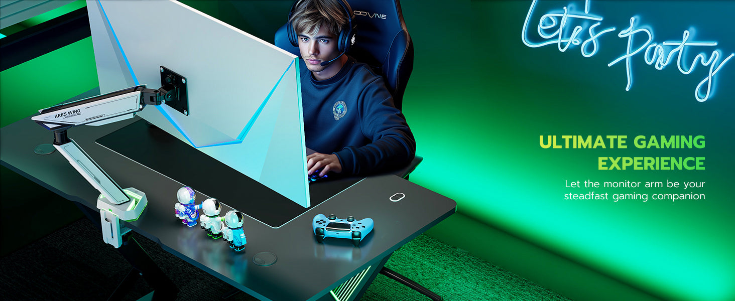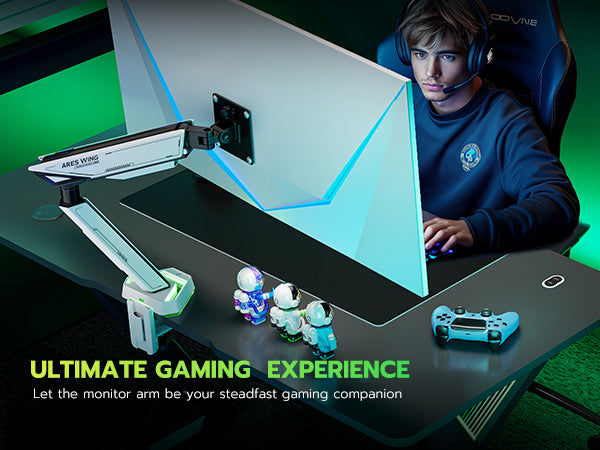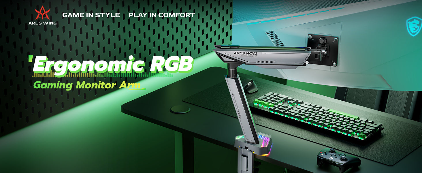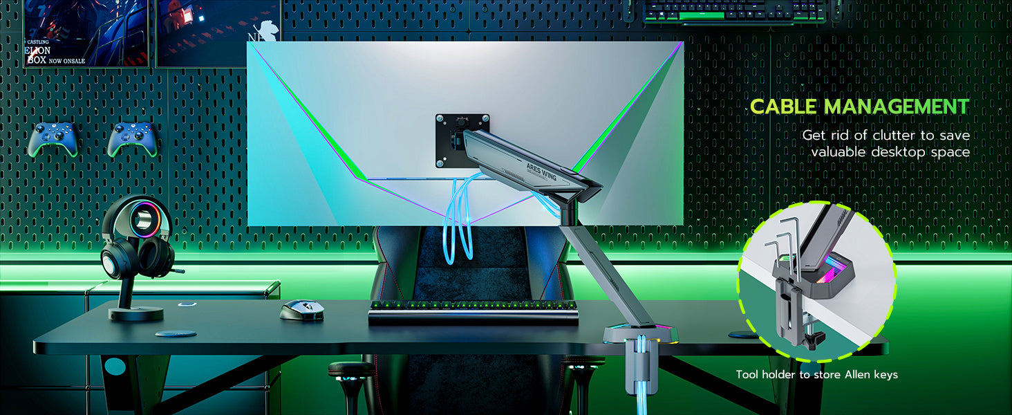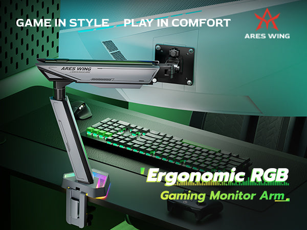 - ARES WING Ultrawide Monitor Mount — Engineered for ultrawide monitors up to 45 inches and 35.2 pounds, this heavy-duty monitor arm delivers both strength and style. Its base features 20 mesmerizing infinite mirror lighting effects, creating a captivating light display without distractions. The quick-release VESA plate simplifies installation, and integrated cable management keeps your setup tidy and streamlined. Built to offer robust stability and flexibility, it’s the ultimate solution for supporting large, heavy monitors.