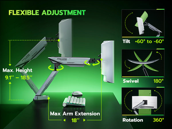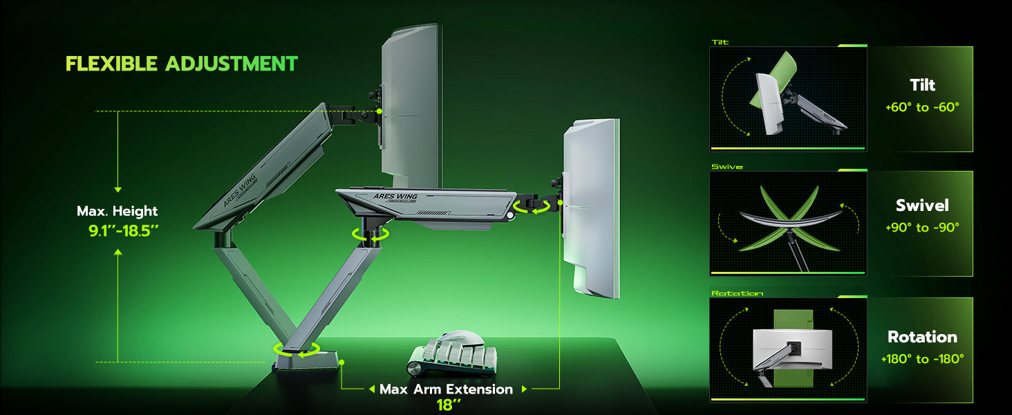 - Full Motion & Ergonomic Design – The ARES WING computer monitor arms offers a comprehensive range of motion with 360° rotation, +60° to -60° tilt, and ±90° swivel, allowing effortless positioning for optimal viewing. It elevates monitors up to 18.5 inches, letting users adjust to the ideal height. Designed with ergonomics in mind, this mount promotes a healthier posture to help reduce neck and shoulder strain during long hours at the desk.