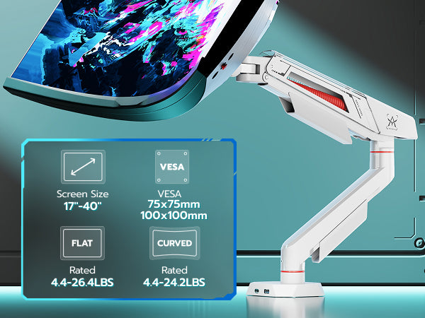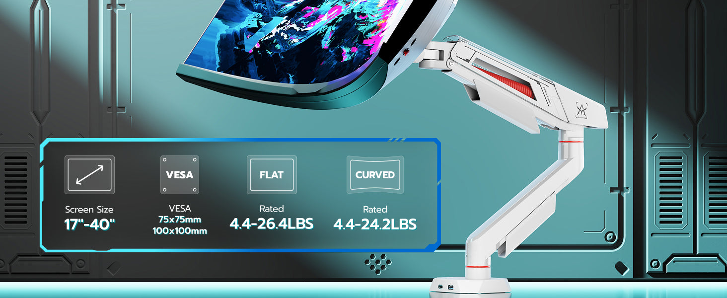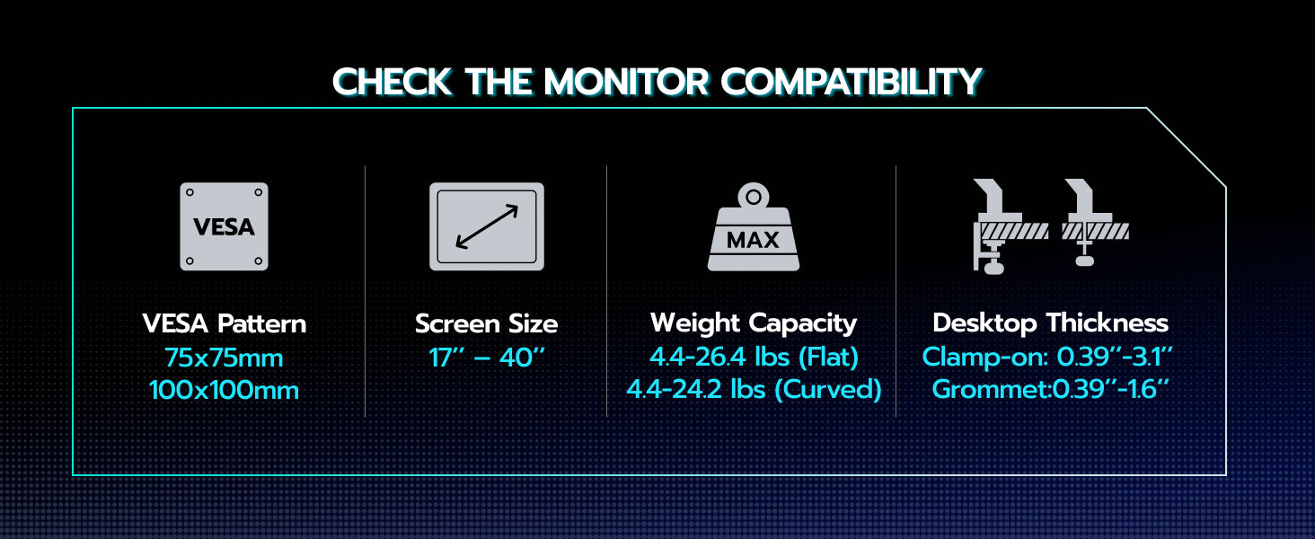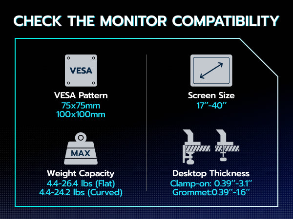 - Wide Compatibility - This monitor mount is compatible with most flat or curved monitors ranging from 17 inches to 40 inches, with a maximum load capacity of 26.5 lbs (24 lbs for curved screens). It supports VESA standards of 75x75 mm or 100x100 mm. Suitable for solid wood or metal desks.