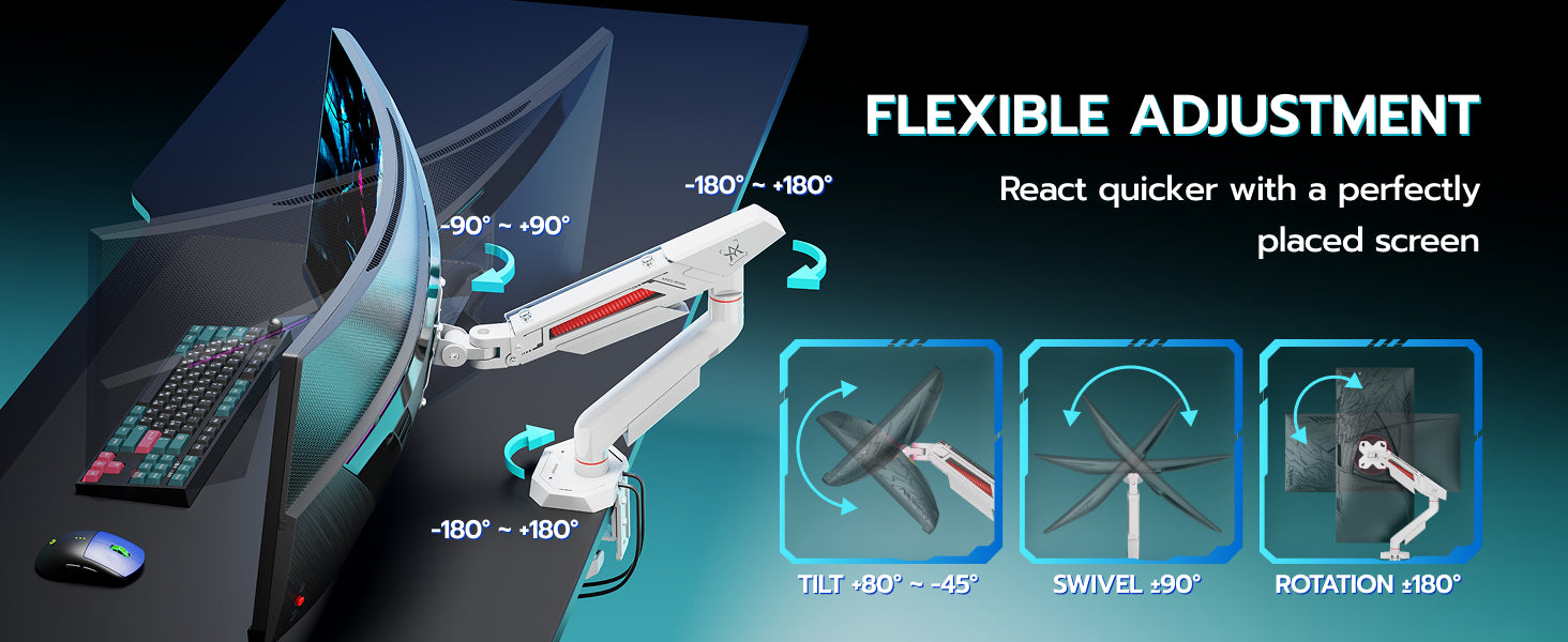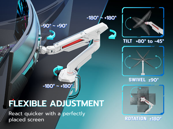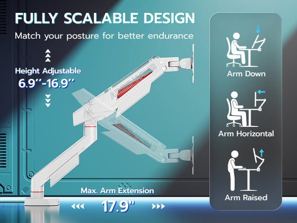 - Comfortable Viewing Angle - Features 6.9-16.9 inch height adjustment, 17.9 inch extension range, ±180° rotation, ±90° swivel, and -45°/+80° tilt, allowing for easy adjustment and a comfortable viewing angle.