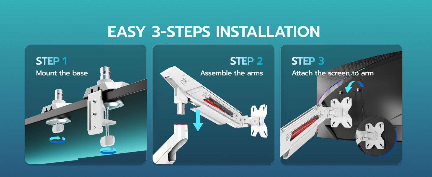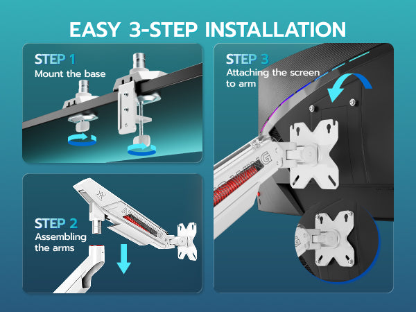 - C-Clamp & Grommet Base - It features full VESA compatibility (75x75, 100x100) and offers two versatile installation options C-Clamp (0.39"-3.1" thick desks) or Grommet Mount (0.39"-1.77" thick desks).