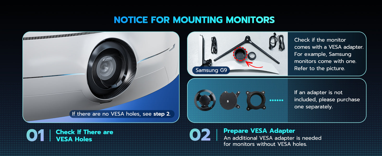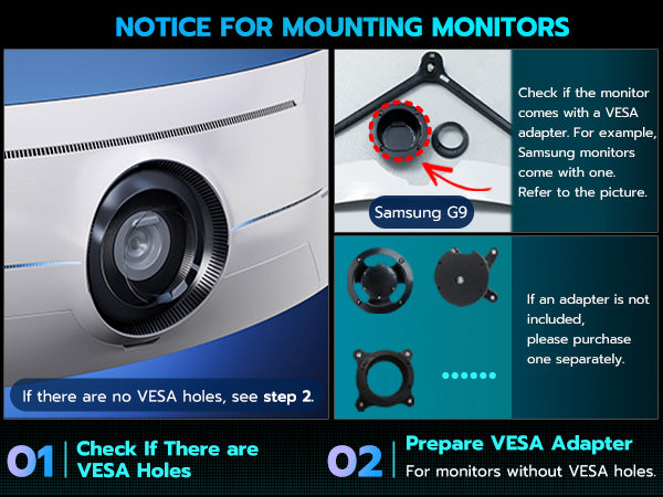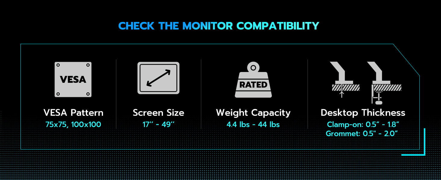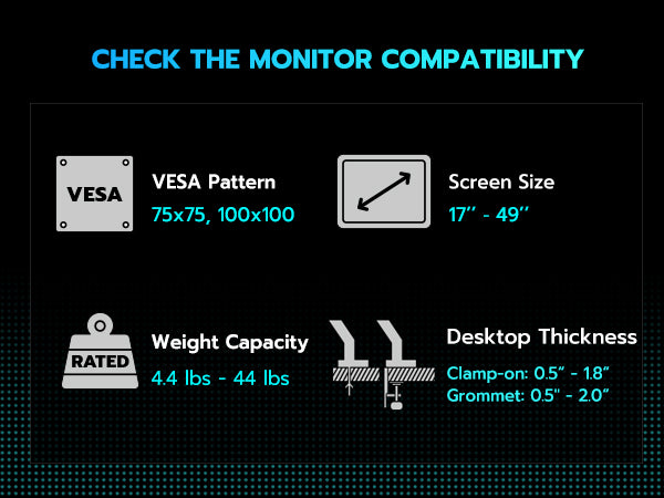 - Supports up to 49" & 44 lbs Monitors – The ARES WING single monitor arm is engineered with an optimized tilt structure, offering exceptional support for ultrawide screens, including popular 49" flat and curved monitors. With a maximum weight capacity of 44 lbs, it securely holds monitors ranging from 17" to 49". The arm is compatible with VESA 100x100mm and 75x75mm standards, ensuring wide compatibility. For non-VESA monitors, a VESA mount adapter will be required to complete the setup