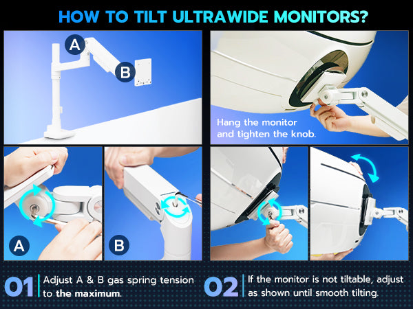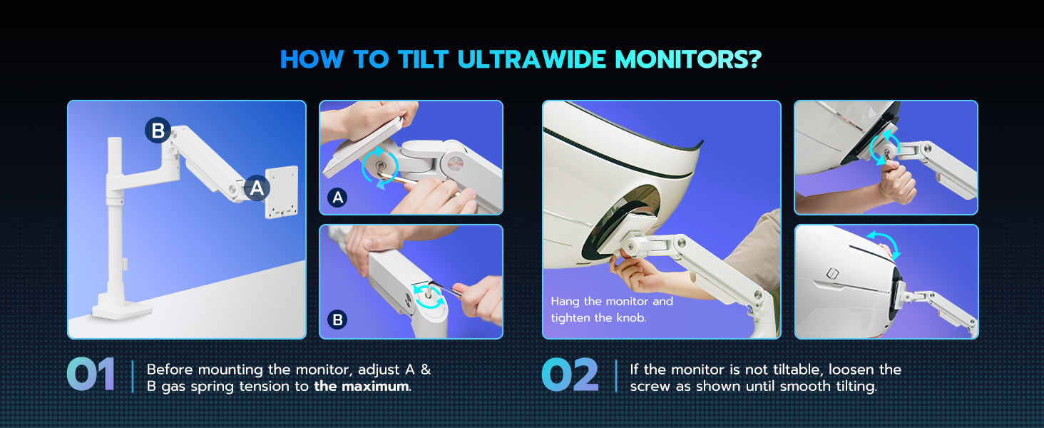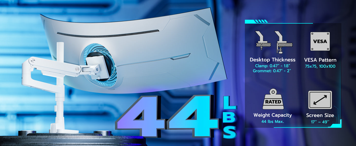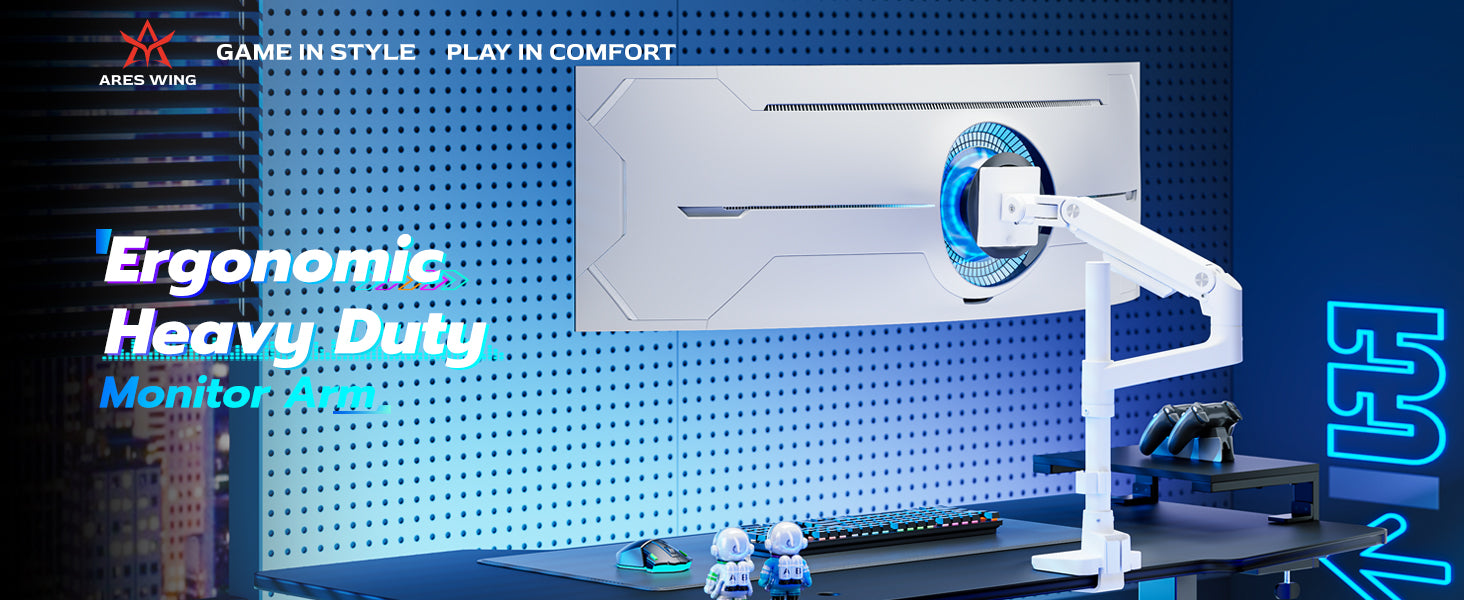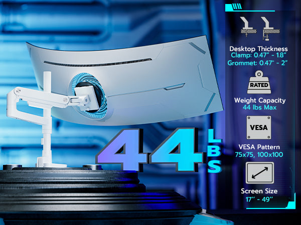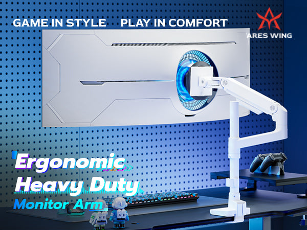- ARES WING Ultrawide Monitor Mount-This Heavy-Duty Monitor Arm is built for ultrawide monitors up to 49" and 44 lbs. Featuring an 18" extended column and a gas spring system, it allows smooth height adjustment and precise positioning. The quick-release VESA plate ensures fast installation, while cable management keeps your setup tidy and streamlined. Designed for strength and flexibility, it's the ideal choice for heavy monitors