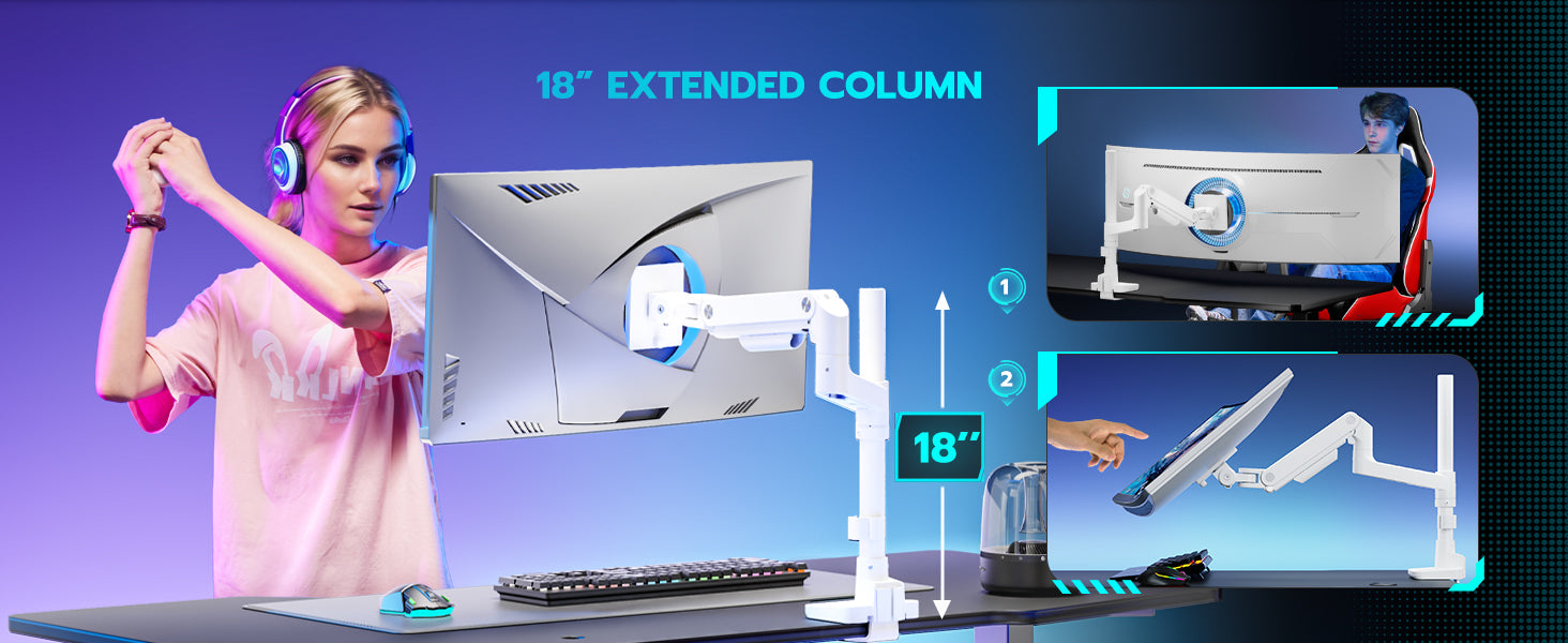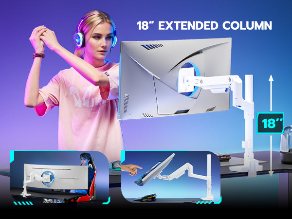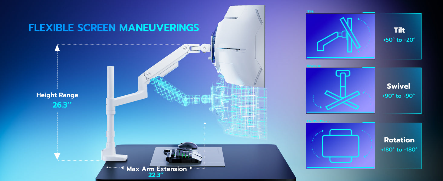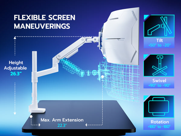 - 18" Extended Column and Gas Spring Design – The ARES WING ultrawide monitor arm features an 18" extended column, offering maximum height adjustment up to 26.3” and an arm extension of 22.3”, providing excellent flexibility. The stable gas spring system enables a smooth tilt range of +50° to -20°, ±90° swivel, and 360° rotation. This height versatility allows for various screen stacking configurations, delivering a more comfortable experience whether you're gaming or watching matches