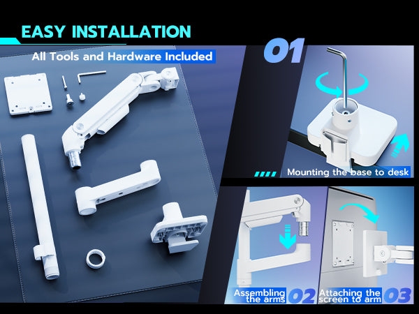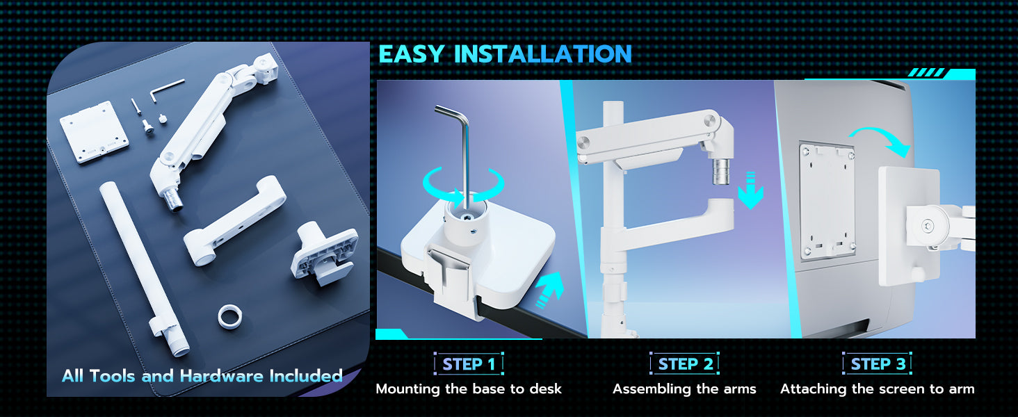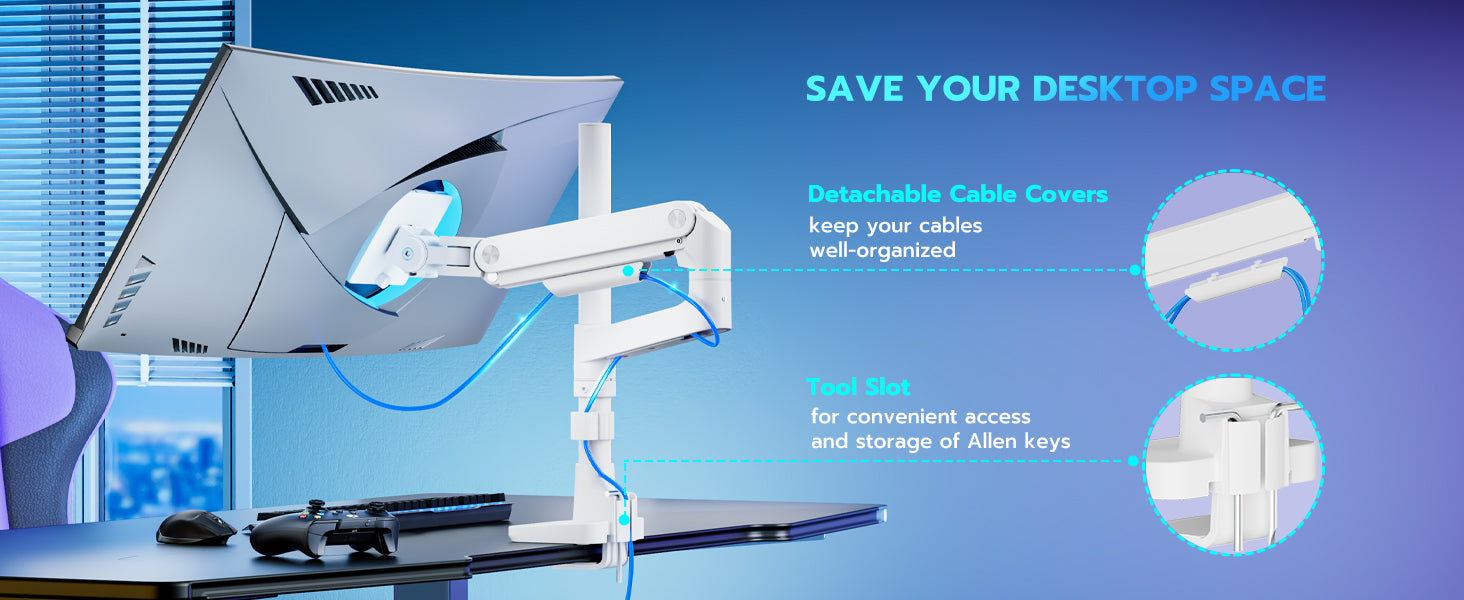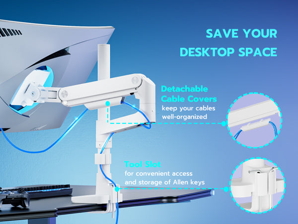 - Cable Management and Convenient Tool Slot – The ARES WING single monitor mount features integrated cable management, keeping your workspace tidy and organized by concealing cables and reducing clutter. Additionally, a convenient tool slot allows easy access to necessary tools during installation or adjustments, ensuring a streamlined and efficient setup process