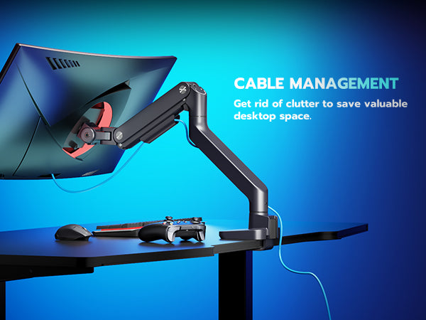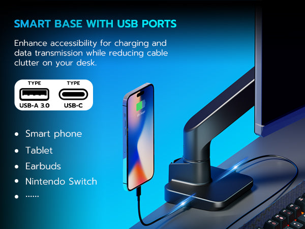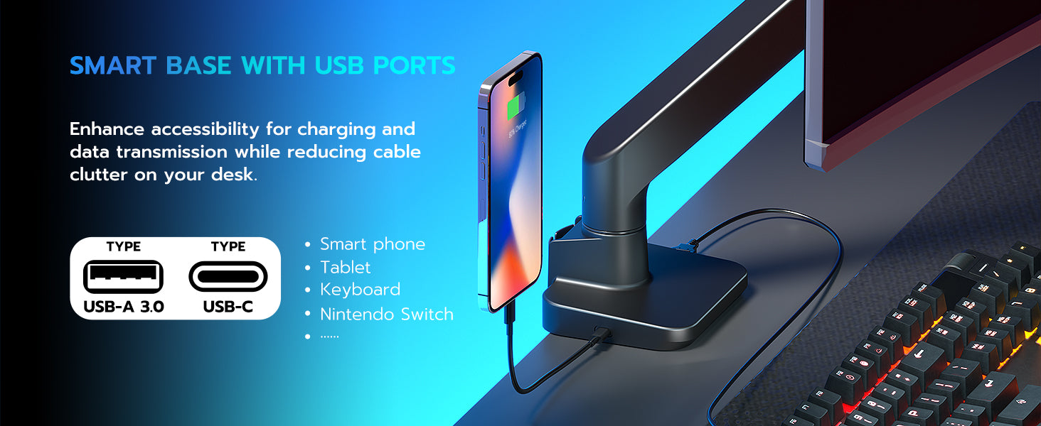 - 【Smart Base with USB A/C Ports】For a tidier working and gaming environment, this ultrawide monitor arm addresses the cable chaos problem and liberates precious desktop real estate. Featuring integrated USB 3.0 ports, it allows effortless charging of your smartphones, game equipment and data transfer. By recovering over 80% of your desktop area, it provides more space for your unique gadgets and decor.