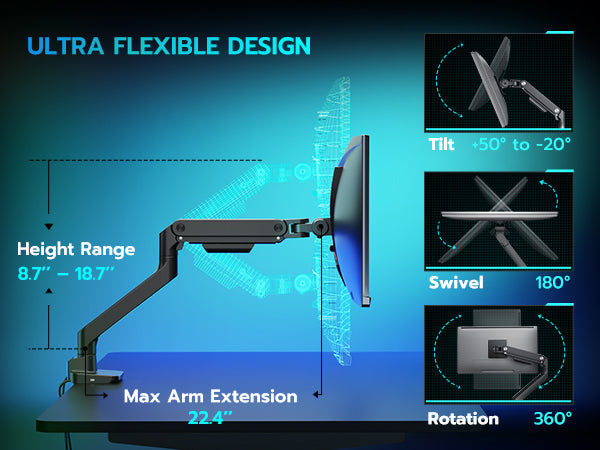 - 【Full Range of Motion】This monitor desk mount arm features excellent flexibility and adjustability. It offers a +50° to -20° tilt, 180° swivel, 360° rotation adjustment, a height adjustable range from 8.7" to 18.7" and a maximum arm extension of 22.4". You can customize an optimal ergonomic posture to reduce the strain on your neck and back, meet a healthier entertainment time.